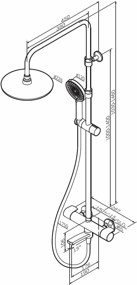 | Комплект поставки | Вентиль; Верхний душ; Держатель для лейки; Душевая лейка; Душевая штанга; Кронштейн для верхнего душа; Переключатель потоков; Смеситель; Шланг для душа; Излив |