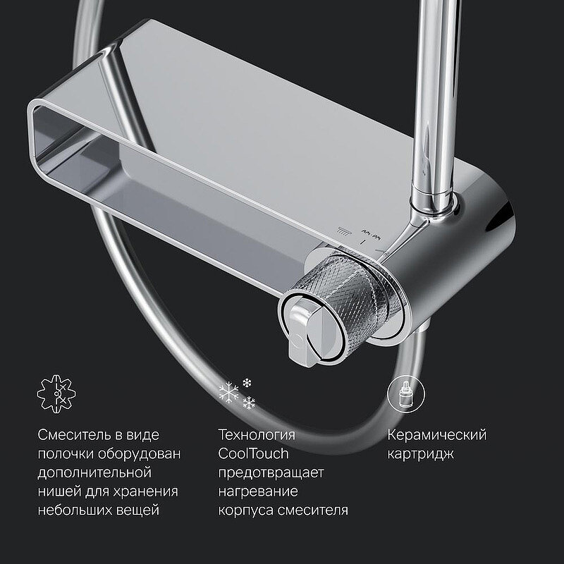 | Комплект поставки | Вентиль; Верхний душ; Держатель для лейки; Душевая лейка; Душевая штанга; Кронштейн для верхнего душа; Переключатель потоков; Смеситель; Шланг для душа |