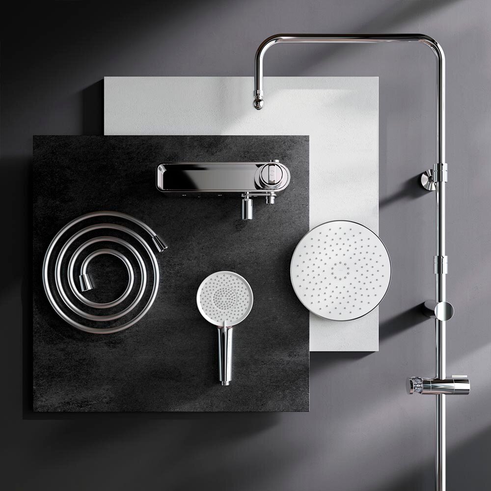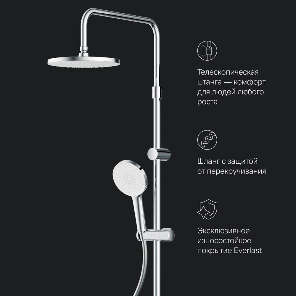 Новое прочтение культовой коллекции X-Joy. Еще больше инновационных решений для вашей ванной комнаты. Трендовые формы, технологичные материалы и продуманные детали, которые теперь доступны каждому. По самой привлекательной цене. Смеситель в виде полочки оборудован дополнительной нишей. Это идеальное решение для современной ванной комнаты, где самые необходимые вещи всегда находятся под рукой. Телескопическая штанга с диапазоном регулировки 400 мм сделает процесс принятия душа удобным для людей любого роста. А благодаря увеличенным размерам тропического (220 мм) и ручного (120 мм) душей вы ощутите все преимущества использования дизайнерского продукта. Душевая система X-Joy была создана для того, чтобы радовать вас каждый день.