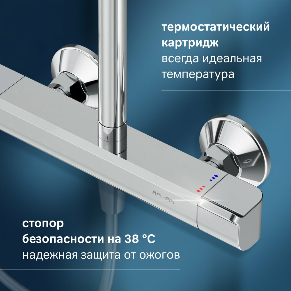 Встречайте коллекцию Func – самую функциональную коллекцию в линейке AM.PM. Инженеры продумали и учли каждую деталь, чтобы сделать процесс использования продуктов максимально простым и комфортным для всех членов семьи. Смеситель для душа с термостатом: термостатический картридж с высокочувствительным термоэлементом и стопором безопасности на 38 градусах надежно защитит от ожога даже при внезапном отключении холодной воды. Продуманные детали для удобства: телескопическая штанга регулируется по высоте, обеспечивая комфорт для людей любого роста. Прямоугольная форма, увеличенный размер леек и 3 режима ручного душа подарят ощущения настоящего домашнего SPA. Безупречный внешний вид: яркий геометричный дизайн и утонченный силуэт – душевая система Func станет настоящим украшением современной ванной комнаты.