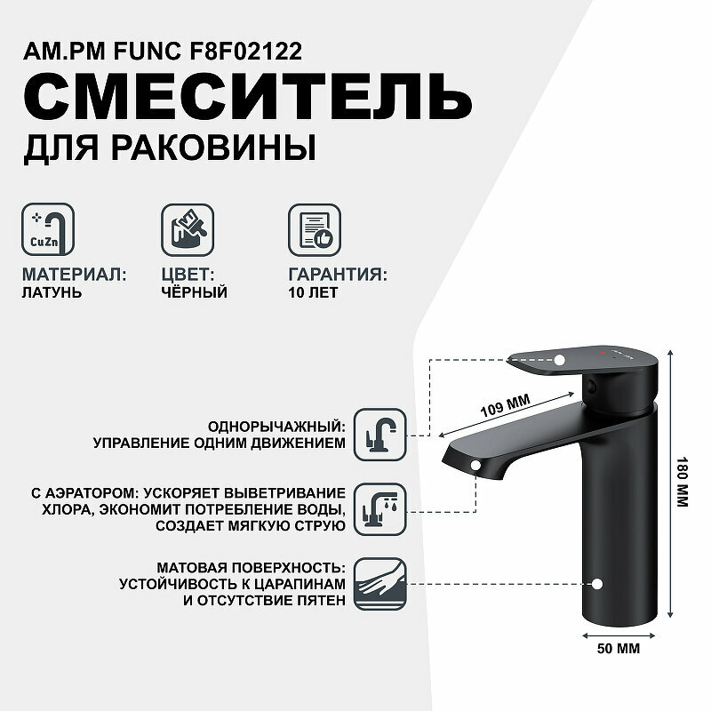 Встречайте коллекцию Func – самую функциональную коллекцию в линейке AM.PM. Наши инженеры продумали и учли каждую деталь чтобы сделать процесс использования продуктов максимально простым и комфортным для всех членов семьи. Безупречный внешний вид: яркий геометричный дизайн и утонченный силуэт – смеситель для раковины Func станет настоящим украшением современной ванной комнаты. Лаконичная ручка идеально ложится в ладонь что значительно облегчает процесс управления и регулировки температуры. Специально спроектированный для АМ.РМ керамический картридж SoftMotion 35 мм позволяет выдерживать любые перепады давления в водопроводной сети сохраняя хороший напор и надежно защищая вас от ожогов
