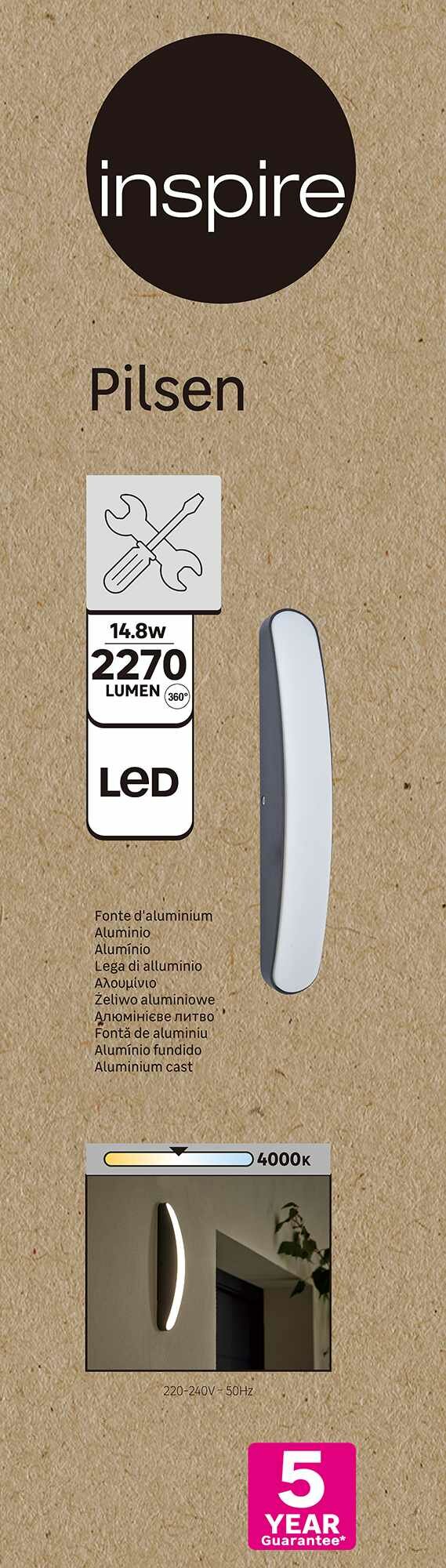 **Светильник светодиодный Inspire «Pilsen»** изготовлен в соответствии с классом пыле- и влагозащиты IP44, поэтому подходит для организации освещения подъезда или коридора. Модель серого цвета, устанавливается на стены. Устройство работает от сети переменного тока с напряжением 220-240 В. Основной материал изготовления — алюминий, дополнительный материал — пластик. Температура цвета — 4000 К (нейтральный белый свет).