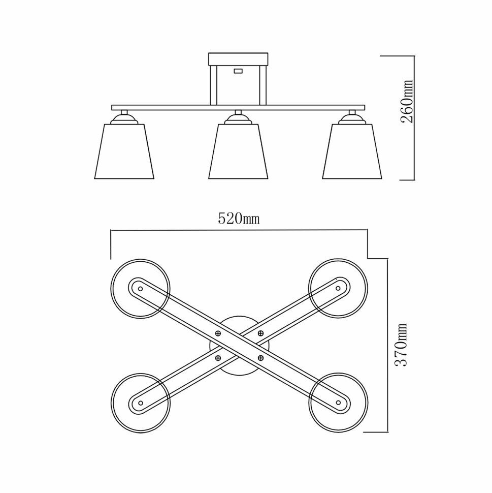 **Люстра подвесная** представляет собой осветительный элемент в виде двух перекрещенных планок, на концах каждой из которых и по центру присутствует трапециевидный стеклянный плафон. Модель изготовлена в лаконичном дизайне, органично смотрится в современных помещениях, украсит интерьеры гостиных, офисов, гостиничных номеров, баров. Может служить основным источником освещения для помещений площадью 18 м² и дополнительным — для больших комнат. Модель крепится к потолку на планку, которая вместе с саморезами идет в комплекте. Корпус светильника изготовлен из прочного, но легкого металла, покрытого антикоррозийным декоративным напылением. В качестве осветительных элементов выступают лампочки с цоколем Е27 (не идут в комплекте). Форму ламп можно подбирать любую : груша, свеча, гриб, свеча на ветру, большой и малый шар. Максимально допустимая мощность ламп — 60 Вт. Подойдут галогенные, филаментные, светодиодные или лампы накаливания.