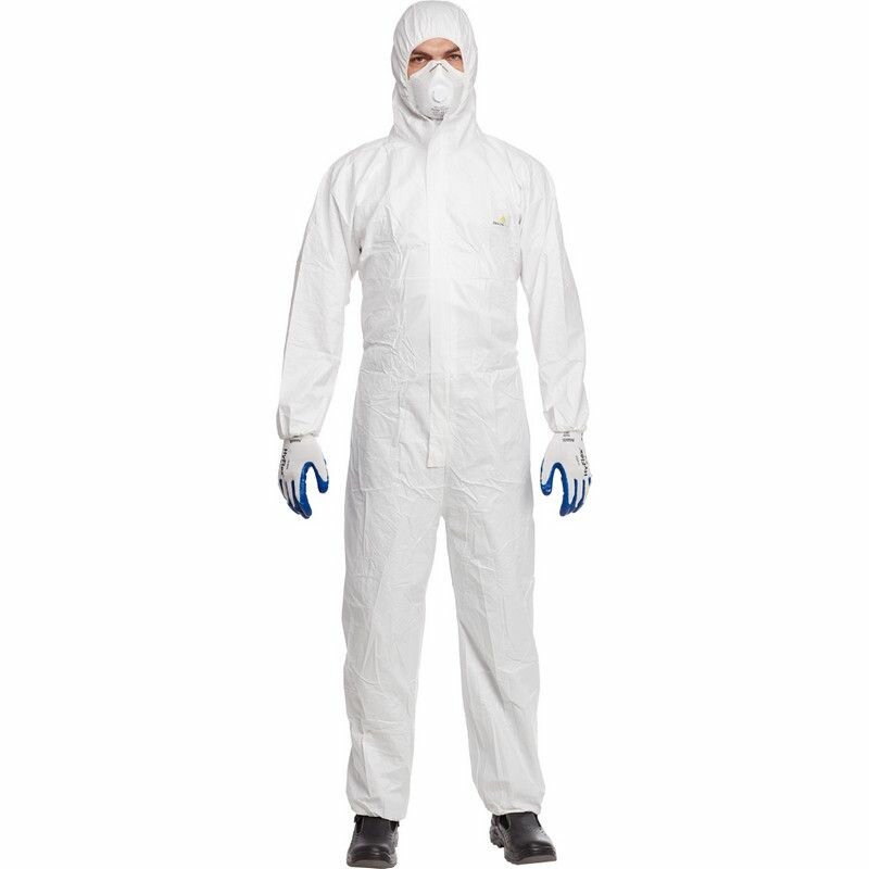 Защитный комбинезон с капюшоном Delta Plus DT115 размер XL, защищает от воздействия загрязнений, воды и химических веществ, а именно от твердых частиц - 5; от брызг кислот, щелочных веществ и воды - 6. Комбинезон обладает антистатическими свойствами. При изготовлении используется легкий нетканый микропористый ламинированный материал (полипропилен, полиэтилен); плотность - 60 г/м² без добавления силикона. Застежка-молния, закрытая защитной планкой. Для большего комфорта на капюшоне, на талии, манжетах рукавов и лодыжках предусмотрена эластичная резинка. Сфера применения - автомобильная промышленность и сервисы, подрядные работы.