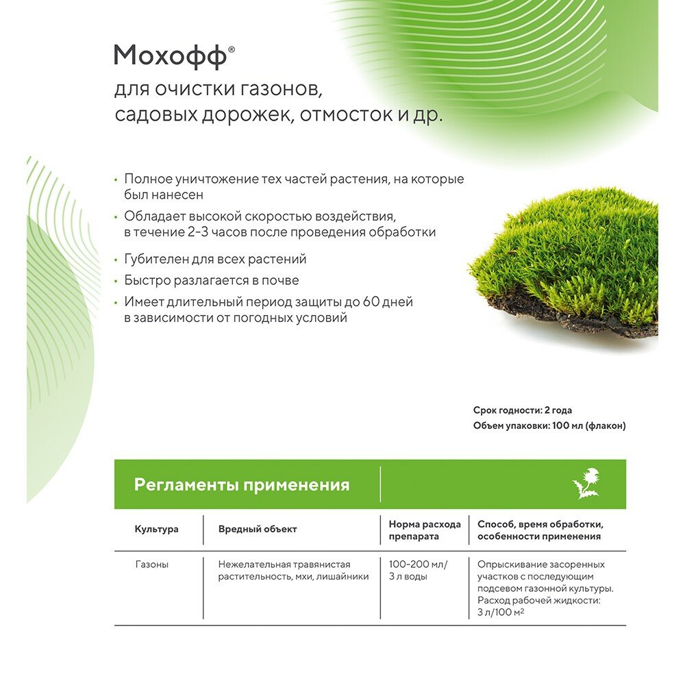 Биопрепарат "Мохофф" легко справляется с такими проблемами как мхи, лишайники и нежелательной травянистой растительностью на газонах, садовых дорожках, отмостках, швах плитки и т.д.