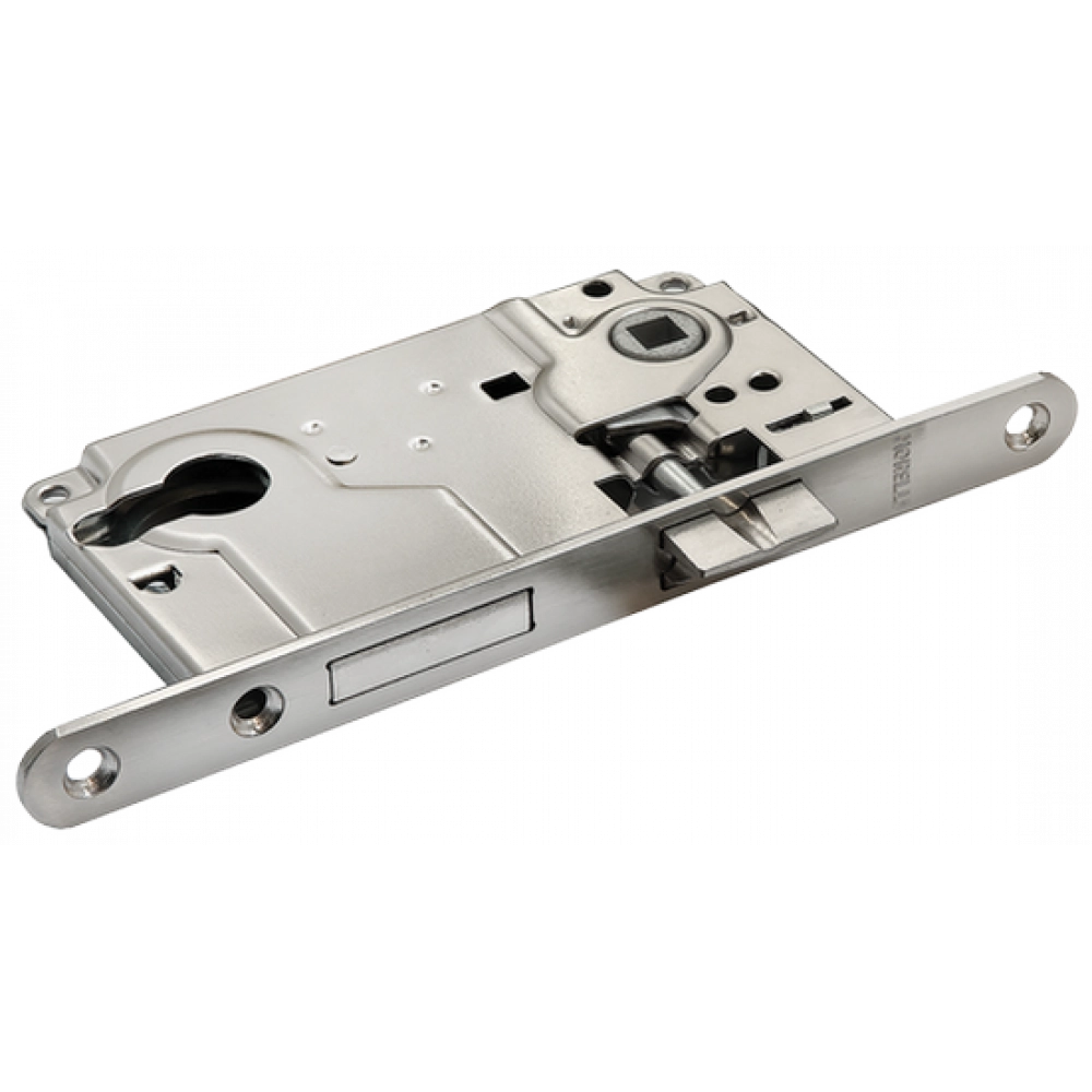 Замок с ригелем под ключевой цилиндр для межкомнатной двери комплектуется с ключевым цилиндром, соответствующим ширине полотна. Подходит для установки, например, на дверь кабинета. Для надежности запирания помимо обычного язычка, используется дополнительный ригель.