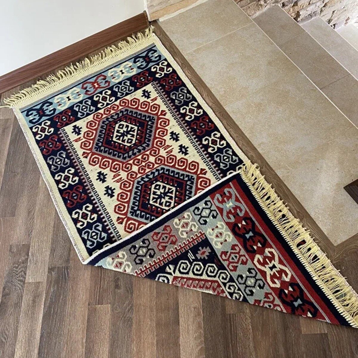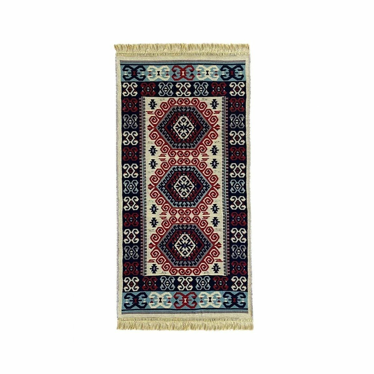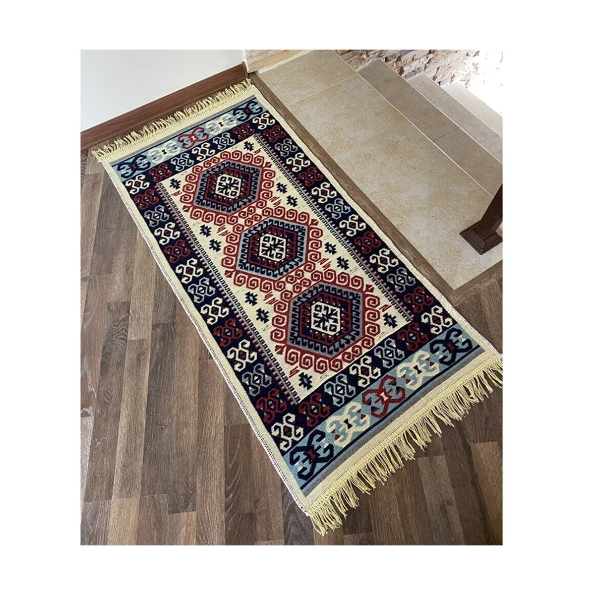 Цветной коврик-половичок с рисунком и бахромой. Состав:50% хлопок, 20% полиэстер,15% акрил, 15% вискоза. Изготовлено в Турции. Тканое изделие достаточно плотное. Подходит для любых помещений в качестве придверного, прикроватного коврика, для балкона, коридора, крыльца и в бане.