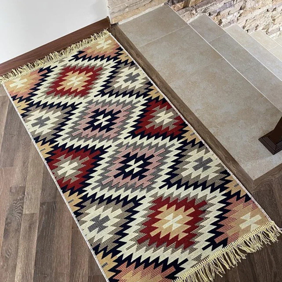 Цветной коврик-половичок с рисунком и бахромой. Состав:50% хлопок, 20% полиэстер,15% акрил, 15% вискоза. Изготовлено в Турции. Тканое изделие достаточно плотное. Подходит для любых помещений в качестве придверного, прикроватного коврика, для балкона, коридора, крыльца и в бане.