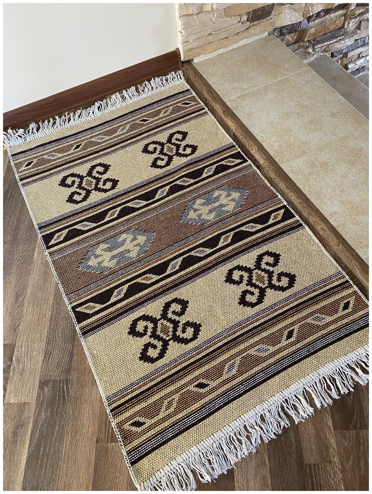 Цветной коврик-половичок с рисунком и бахромой. Состав:50% хлопок, 20% полиэстер,15% акрил, 15% вискоза. Изготовлено в Турции. Тканое изделие достаточно плотное. Подходит для любых помещений в качестве придверного, прикроватного коврика, для балкона, коридора, крыльца и в бане.