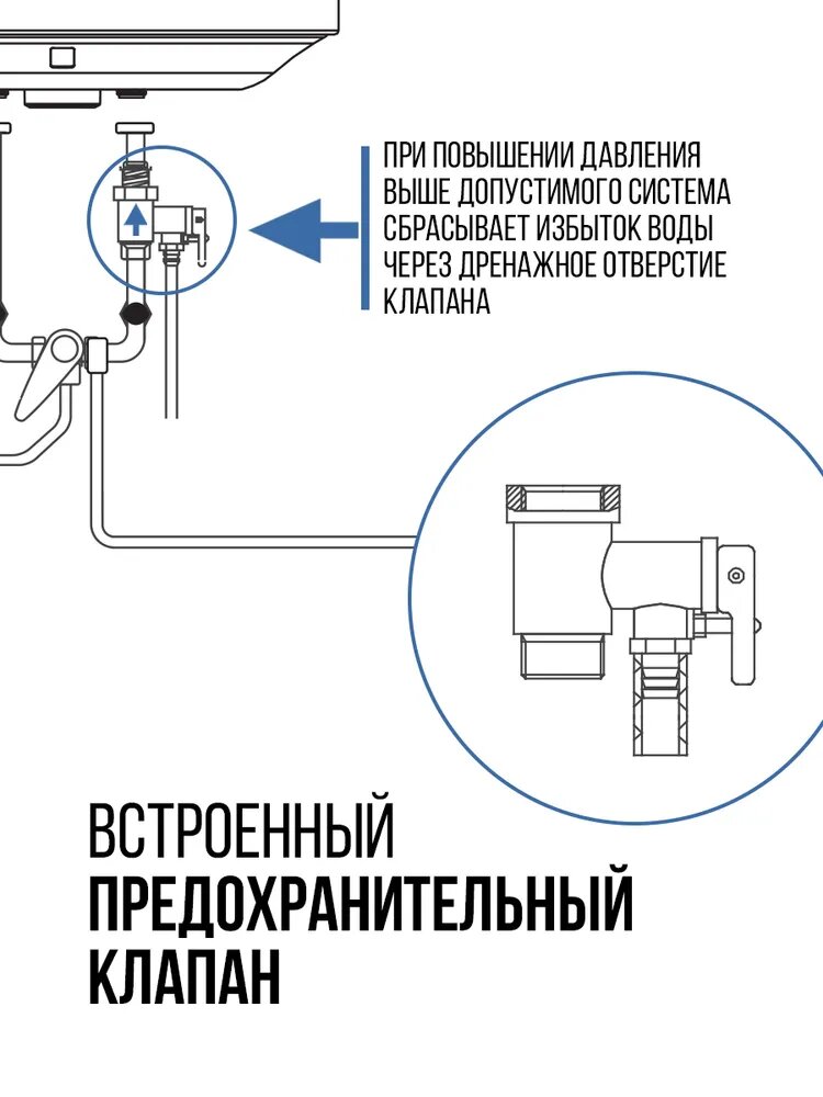 | Комплект поставки | • Водонагреватель — 1 шт. • Анкерный болт — 2 шт. • Предохранительный клапан — 1 шт. • Руководство по эксплуатации — 1 шт. • Гарантийный талон (в руководстве). |