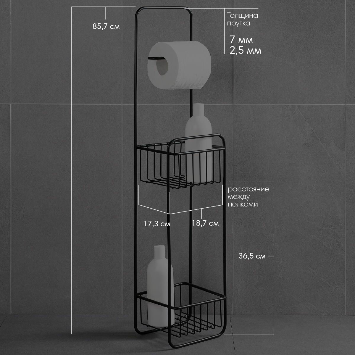 Двухъярусный напольный стеллаж с держателем для туалетной бумаги из стали с полимерным покрытием черного цвета. Размеры стеллажа: 18,7х17,3х85,7 см. Выдерживает вес до 20 кг. Полимерное покрытие повышает стойкость к коррозии. А специальная добавка, входящая в состав краски, обеспечивает защиту от микроцарапин, что увеличивает срок службы стеллажа. Узкая форма экономит пространство квартиры и позволяет стеллажу поместиться даже в самых маленьких ванных комнатах. Увеличенное расстояние между ярусами обеспечивает удобное хранение высоких бутылочек с косметическими средствами. Встроенный держатель для туалетной бумаги является хорошей альтернативой навеске, так как он избавляет от вынужденного сверления плитки. Универсальный черный дизайн также хорошо впишется в интерьер кухни и гостиной.