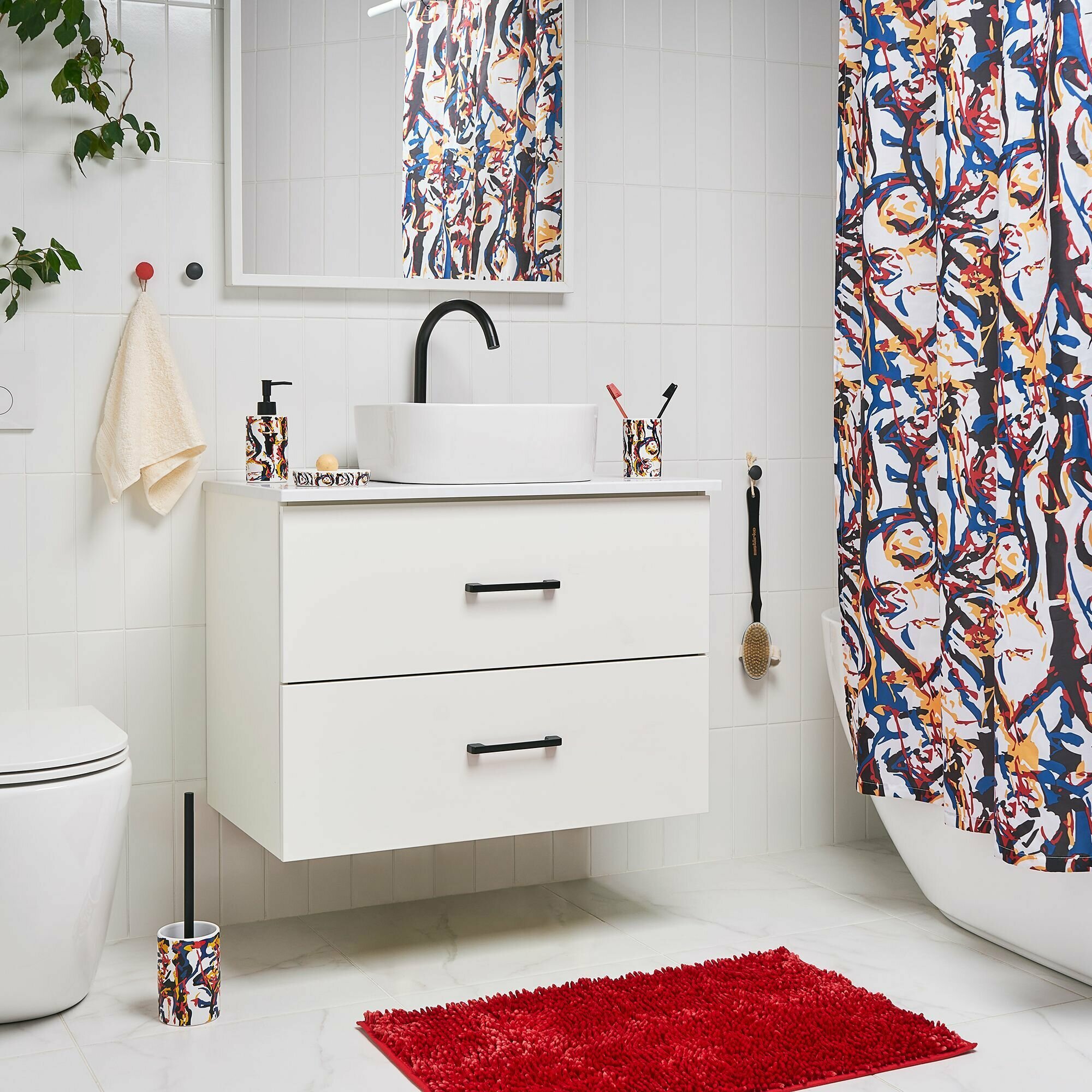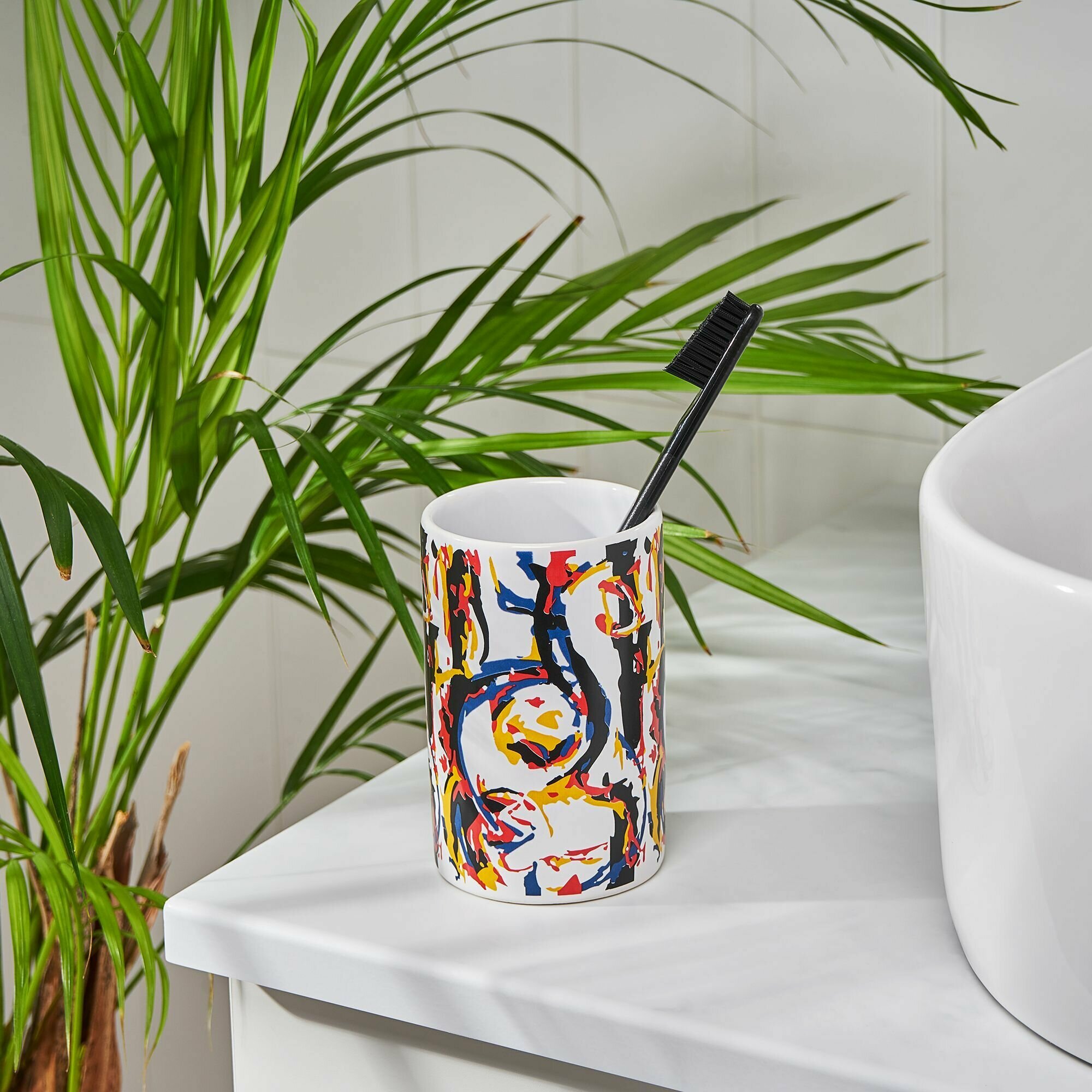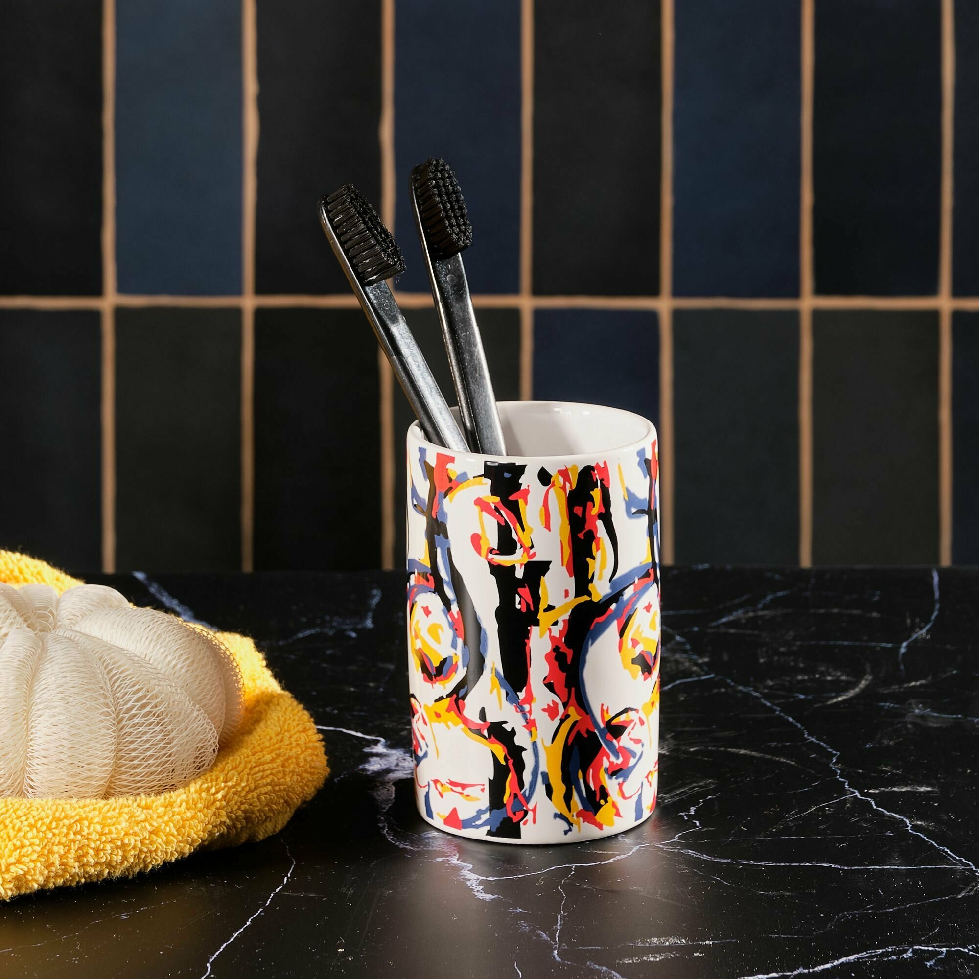Дизайн стакана для зубных щёток Expressia вдохновлён харизматичным творчеством американского художника-экспрессиониста Джексона Поллока. Разноцветные мазки и брызги имитируют технику его написания. Высота изделия 11 см. Он выполнен из качественной керамики. Широкий верх с круглым горлышком позволяет хранить в стакане несколько зубных щёток. Изделие идеально дополняет другие аксессуары из коллекции Expressia.