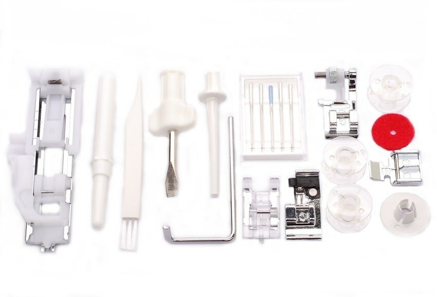 Стандартный набор для данной швейной машинки включает в себя большое количество лапок (для автоматический петли, пришивания пуговиц, потайной строчки, оверлочной строчки, втачивания молнии) Аксессуары тоже нельзя назвать скудными: направитель для квилтинга, несколько шпулек, дополнительный катушечный стержень (если вдруг понадобится шитье двойной иглой), вспарыватель, щеточка, отвертка, фетровая подкладка, два держателя катушки )малый и большой), а также небольшой набор игл. Поскольку у данной модели горизонтальный челнок, смазывать его не требуется. Поэтому масленки в наборе нет.