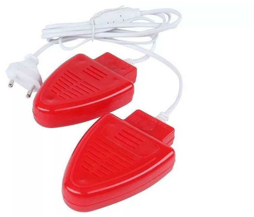 Два пластмассовых прибора треугольной формы помещаются внутрь обуви, затем данный прибор включается в электросеть.