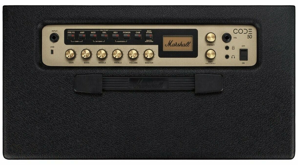 MARSHALL CODE50 - моделирующий гитарный комбоусилитель, полностью программируемый, сочетает в себе подлинное моделирование классических и современных тонов Marshall с профессиональным качеством FX.CODE50 предусилители, усилители мощности и акустической системы модели были разработаны в сотрудничестве с аудио программным обеспечением Softube для создания Marshall-Softube (MST), высокую точность воссозданных классических и современных продуктов Marshall и многое другое.CODE50 имеет 14 MST предусилителей, 4 усилителей мощности MST и 8 кабинетов громкоговорителей MST. Он имеет 24 FX, включая: компрессор, классические педали, Auto Wah, Pitch Shifter, Chorus, Phaser, Flanger и Tremolo. Он включает в себя задержки с Tap Tempo и ревербераторами студийного качества.MST предусилители производят некоторые из самых известных и самых любимых тонов Маршалла:JTM45 2245, 1962 Bluesbreaker1959SLP ПлексиJCM800 2203JCM2555 Silver JubileeJCM2000 DSL100JVM410H и другиеCODE50 имеет особенности EL34, 5881, EL84 и 6L6 MST усилители мощности и MST модели динамика: 1960, 1960V, 1960AX, 1960HW, 1936, 1936V, 1912 & 1974X.Подключение через Bluetooth® для управления исходным кодом и для потоковой передачи музыки с прошивкой или Android устройства с помощью приложения GatewayTM. Подключение через USB позволяет использовать код в качестве интерфейса DAW для записи и потоковой передачи аудио с компьютера.Подключите MP3-плеер с помощью выделенного аудио ввода, чтобы вместе с любимыми треками или подключить наушники для личного опыта CODE. Программируемый footcontroller позволяет назначить до 30 предустановок.
