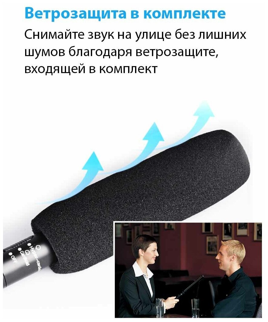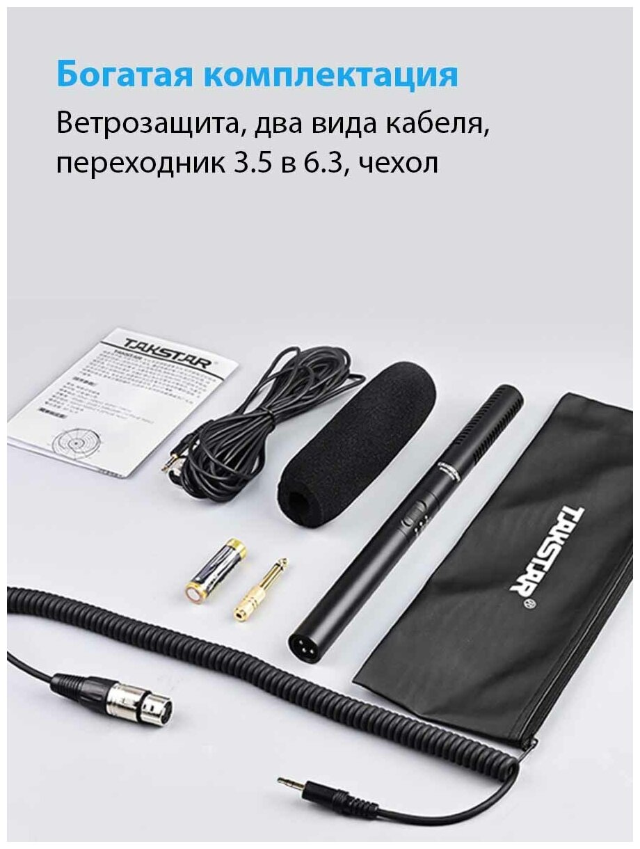 Внешний узконаправленный микрофон-пушка Takstar профессионального уровня со стандартным разъемом XLR предназначен для качественной записи звука при ведении видеоблога, записи интервью или для съемки на YouTube. Он отлично принимает и записывает звук с расстояния до 10 метров. Идеален для записи различных концертов, выступлений на больших конференциях, а также для записи кино- и телепрограмм на открытом воздухе. Takstar оснащен переключателем направленности для записи звука с близких и с далеких источников. Поролоновая ветрозащита, специальная насадка из комплекта, будет особенно полезна при ведении аудиозаписи на улице и открытой местности, так как благодаря конструкции снижает звуки ветра, шум улицы, не искажая частотную характеристику. В комплектацию модели входит - чехол; - батарея; - пружинный шнур (штекеры - XLR - 3,5 мм) 160 см, обеспечивающий более гибкую работу в полевых условиях; - кабель (штекеры - XLR - 3,5 мм) 6 м; - переходник-адаптер (6,5 - 3,5 мм). Характеристики Направленность: одиночная направленность Частотный диапазон: 50Hz-16000Hz/ 80Hz-14000Hz Чувствительность: - для дальней дистанции -30 дБ ± 2 дБ (0 дБ = 1 В / Па при 1 кГц) - для близкой дистанции -45 дБ ± 2 дБ (0 дБ = 1 В / Па при 1 кГц) Эффективное расстояние - не более 10м от объекта Соотношение сигнал-шум: 120dB Питание: батарея 1.5V AA Размеры корпуса: Ø22 x 278 мм