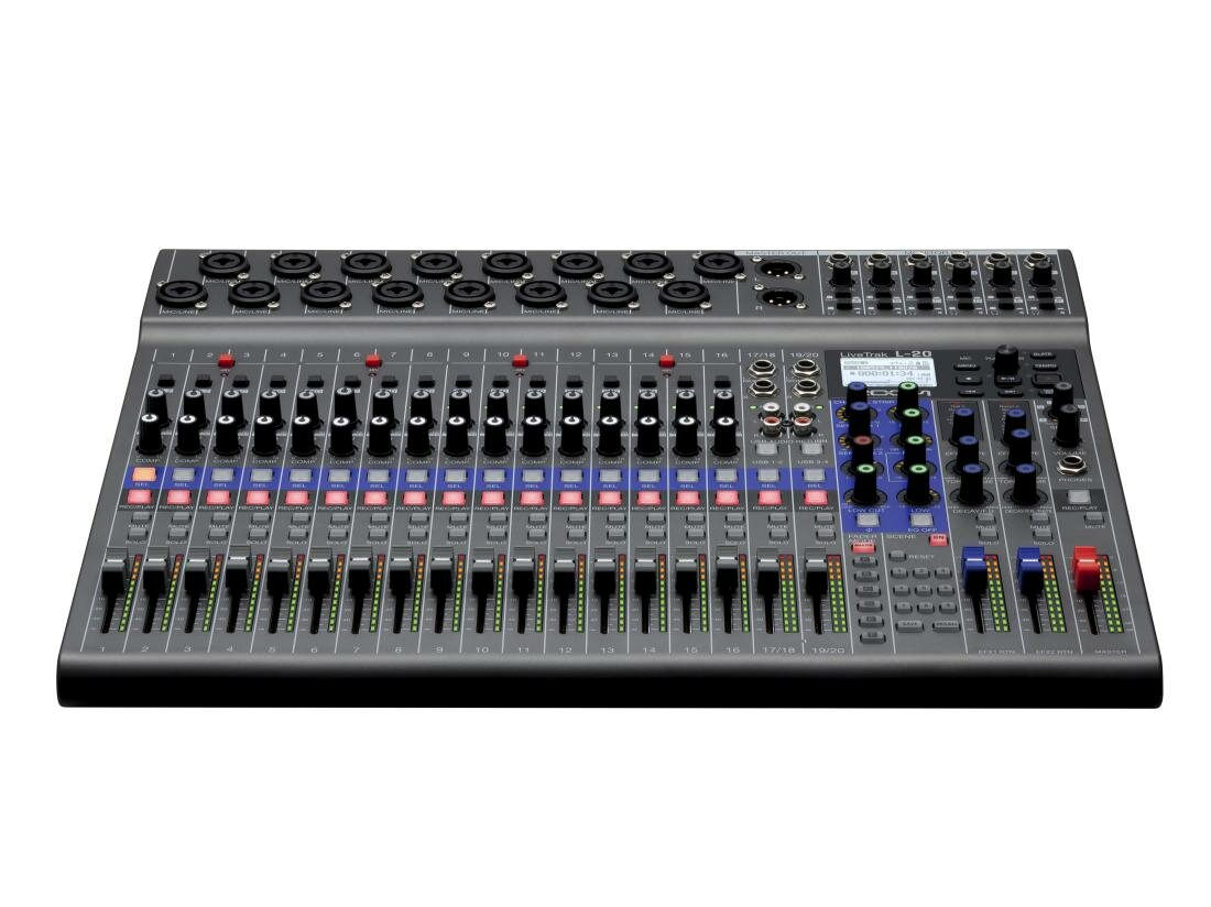 LiveTrak L-20 был создан, чтобы делать сложные миксы. Он оснащен 20-ю входами (16 моно микрофонных/линейных входов и два стереовхода) с собственными трехполосными эквалайзерами с параметрической серединой. 16 монофонических входов также позволяют автономно управлять компрессором.