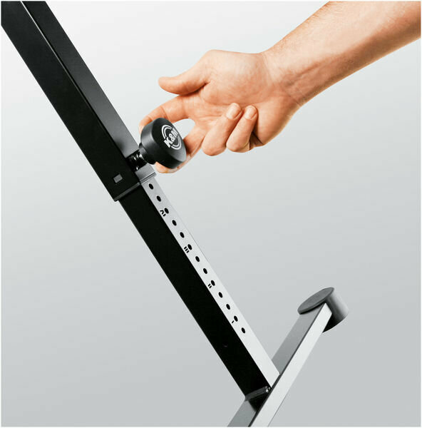 Двусторонние подпружиненные стопорные винты упрощают точную регулировку высоты, а опорные кронштейны можно отрегулировать в соответствии с размером клавишного инструмента.