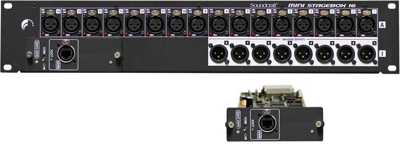 Soundcraft представляет собой двухрековый стейджбокс от компании Soundcraft. имеет 16 аналоговых входов и 8 аналоговых линейных выходов, общая емкость 16 входов и 8 выходов, подсоединяется к любому Soundcraft Si Series и Vi Series консоли через опциональную карту MADI в опциональном слоте. В комплект входит карта связи для пультов Si