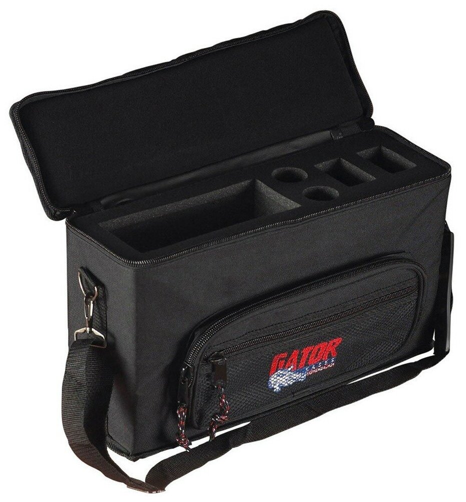 GATOR - кейс для радиосистем. Данная модель разработана для переноски и защиты от внешних воздействий двух радиосистем. Кейс выполнен из прочного нейлона. Также есть дополнительные карманы для аксессуаров. Подходит по размерам для большинства популярных аудиосистем Audio-Technica, AKG и других. Характеристики: Тип: кейс для 2 радиосистем Материал верха: 600D нейлон Цвет: черный Внутренние размеры: 21,59 х 21,59 х 8,26 см Вес: 1,36 кг