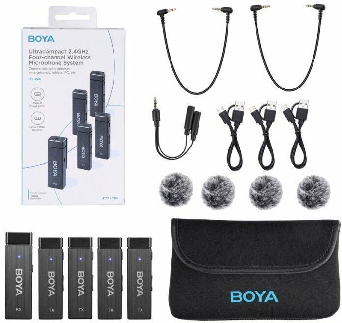 | Комплект поставки | Передающий передатчик BY-W4 * 4 Радиочастотный приемник BY-W4 *1 3,5 мм выходной кабель TRRS-TRS для камер * 1 3,5 мм выходной кабель TRRS-TRRS для смартфонов * 1 3,5 мм кабель TRRS от штекера до двух штекеров TRRS * 1 Кабель для зарядки USB-C * 3 Ветровое стекло из меха *4 Чехол для переноски * 1 |