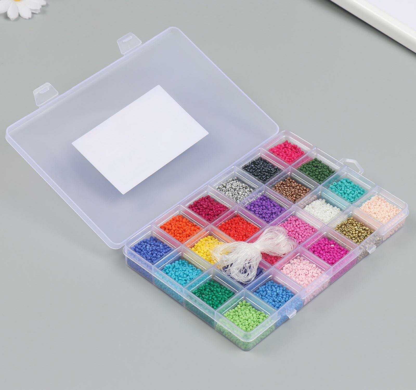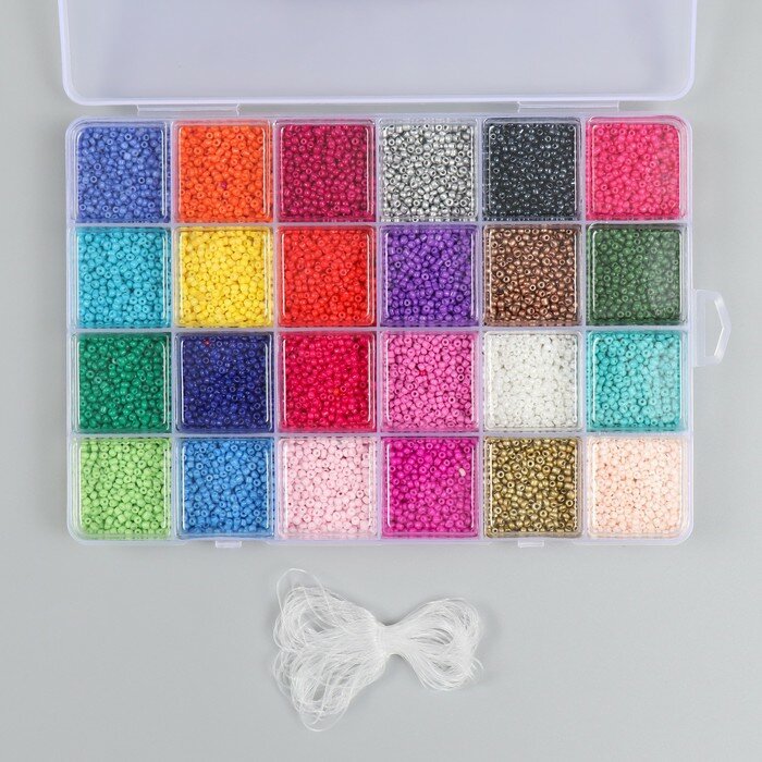 В набор входит стеклянный бисер размером 12/0, 10 метров эластичной нити, плотный пластиковый бокс размером 19х13х2,2 см с ячейками и надежными защелками для удобного хранения. Бисер непрозрачный, 24 различных цвета по 12,5 грамм. Каждый цвет находится в отдельной ячейке. Диаметр эластичной нити - 0,5 мм.