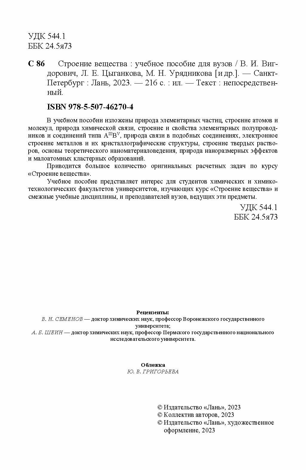 Строение вещества. Учебное пособие (Вигдорович Владимир Ильич, Цыганкова Людмила Евгеньевна, Урядникова Марина Николаевна); Лань, 2023
