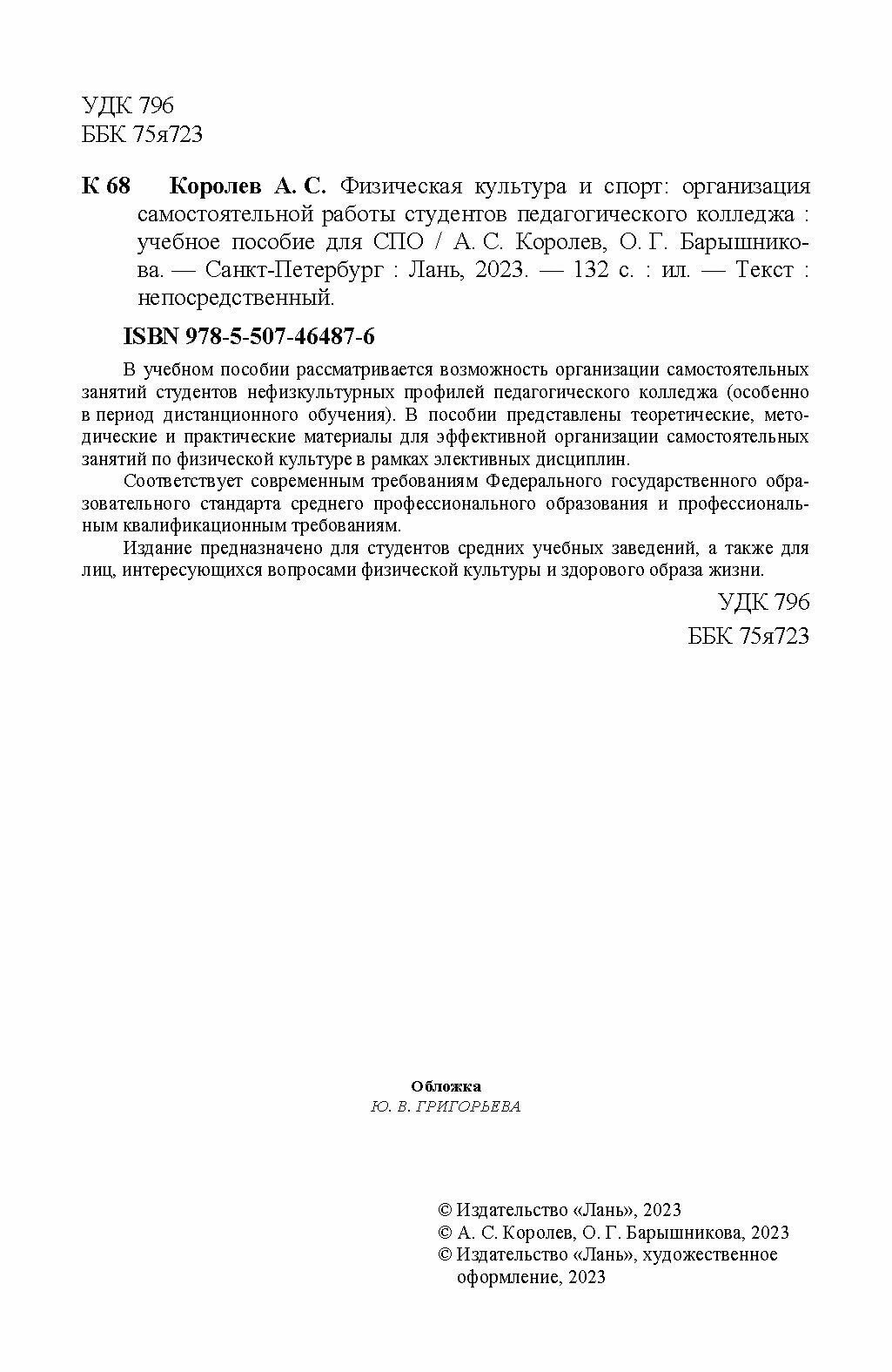 Физическая культура и спорт. Организация самостоятельной работы студентов педагогического колледжа (А. С. Королев); Издательство ЛАНЬ, 2023