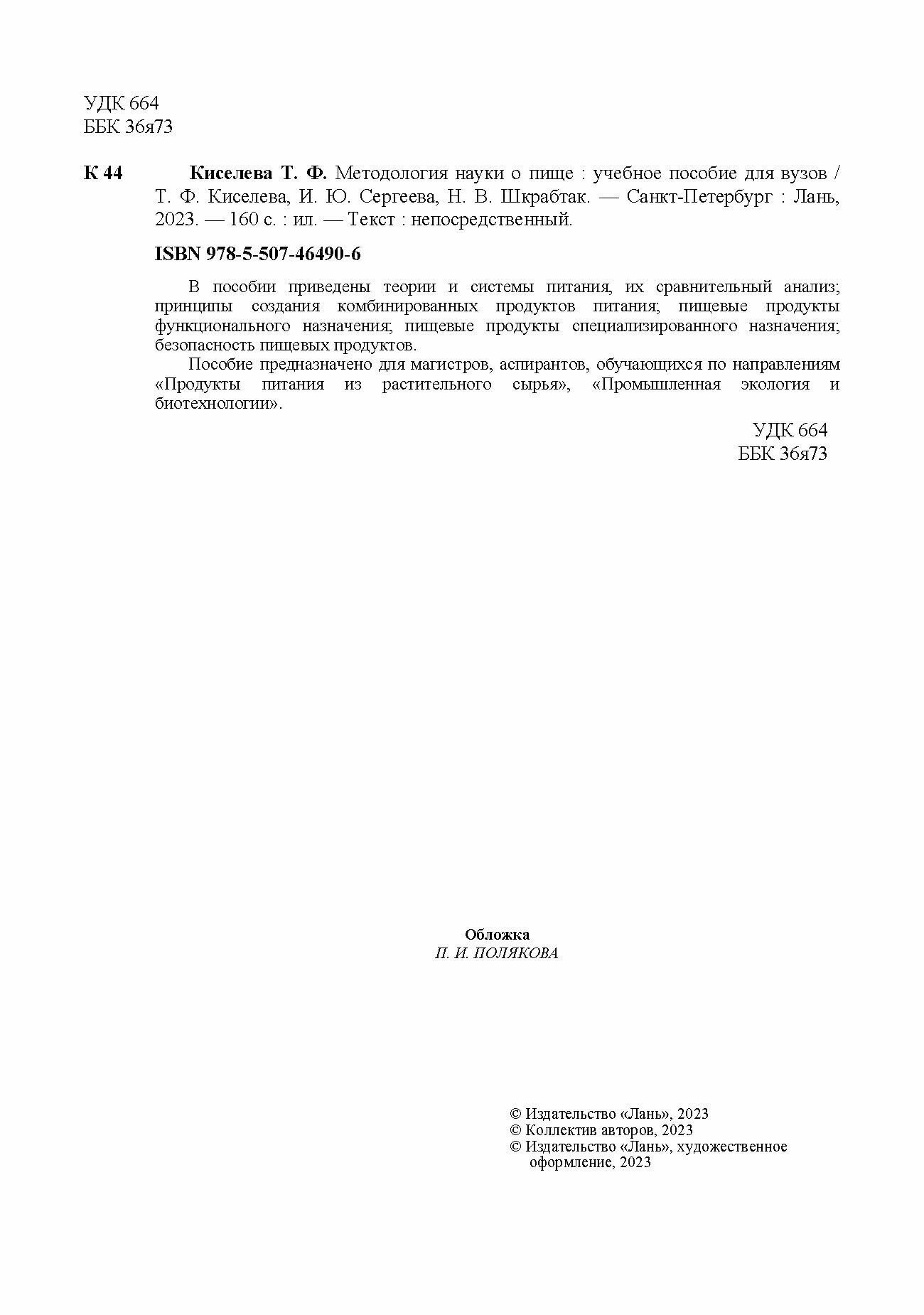 Методология науки о пище. Учебное пособие для вузов (Киселева Татьяна Федоровна, Сергеева Ирина Юрьевна, Шкрабтак Наталья Викторовна); Лань, 2023