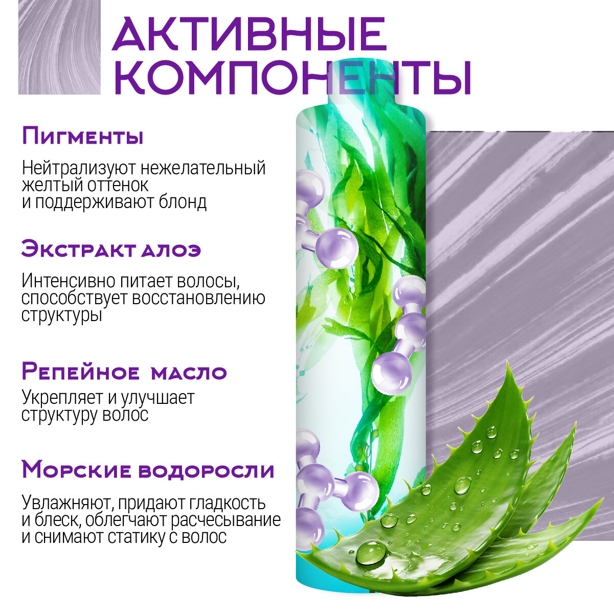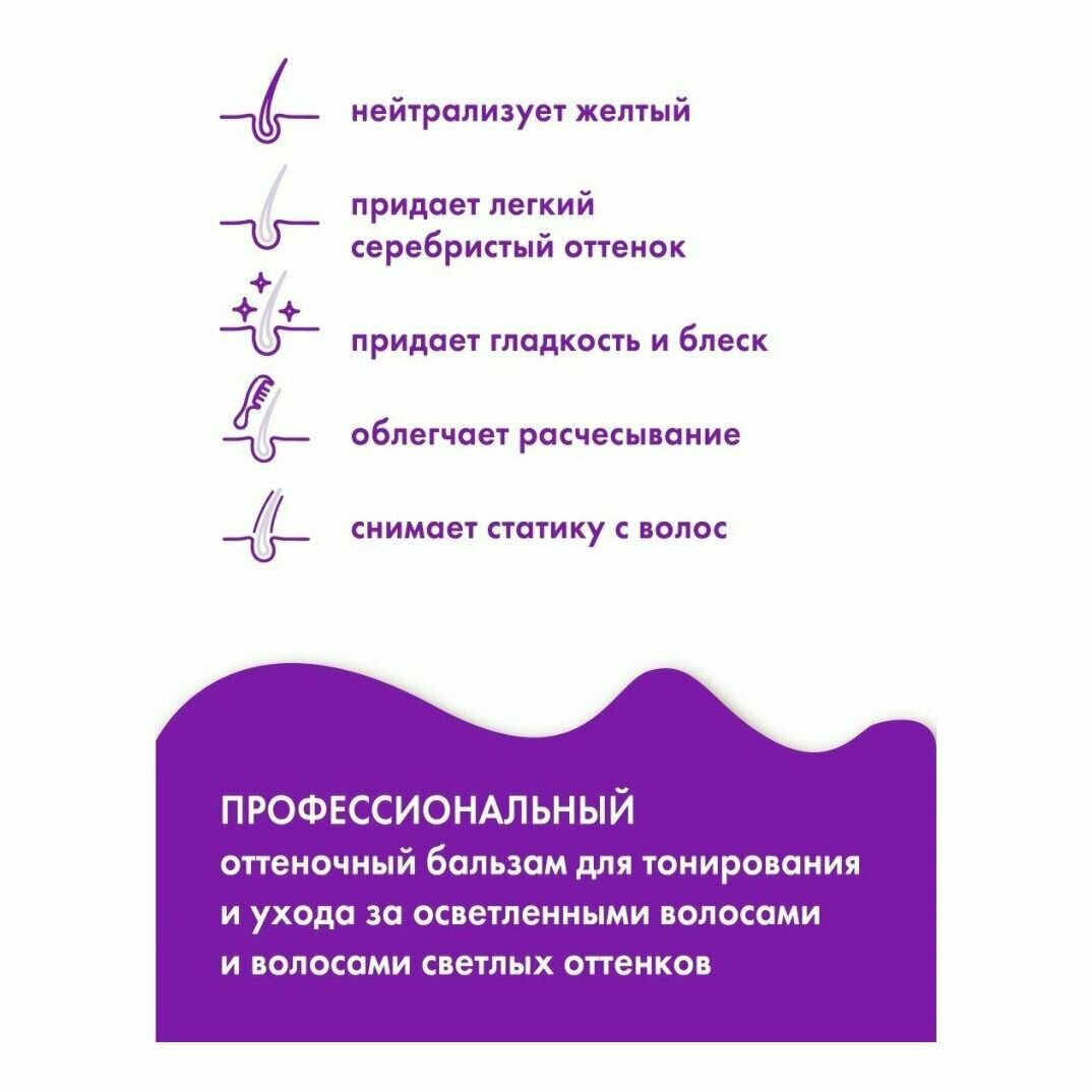 Пигменты бальзама нейтрализуют нежелательный желтый оттенок на осветленных и окрашенных в светлые тона волосах, придавая им легкий серебристый оттенок. Сбалансированный комплекс кондиционеров и биологически активных веществ увлажняет, придает гладкость и блеск, облегчает расчесывание и снимает статику с волос. Натуральные компоненты, входящие в состав бальзама, интенсивно питают волосы, способствуют восстановлению структуры.