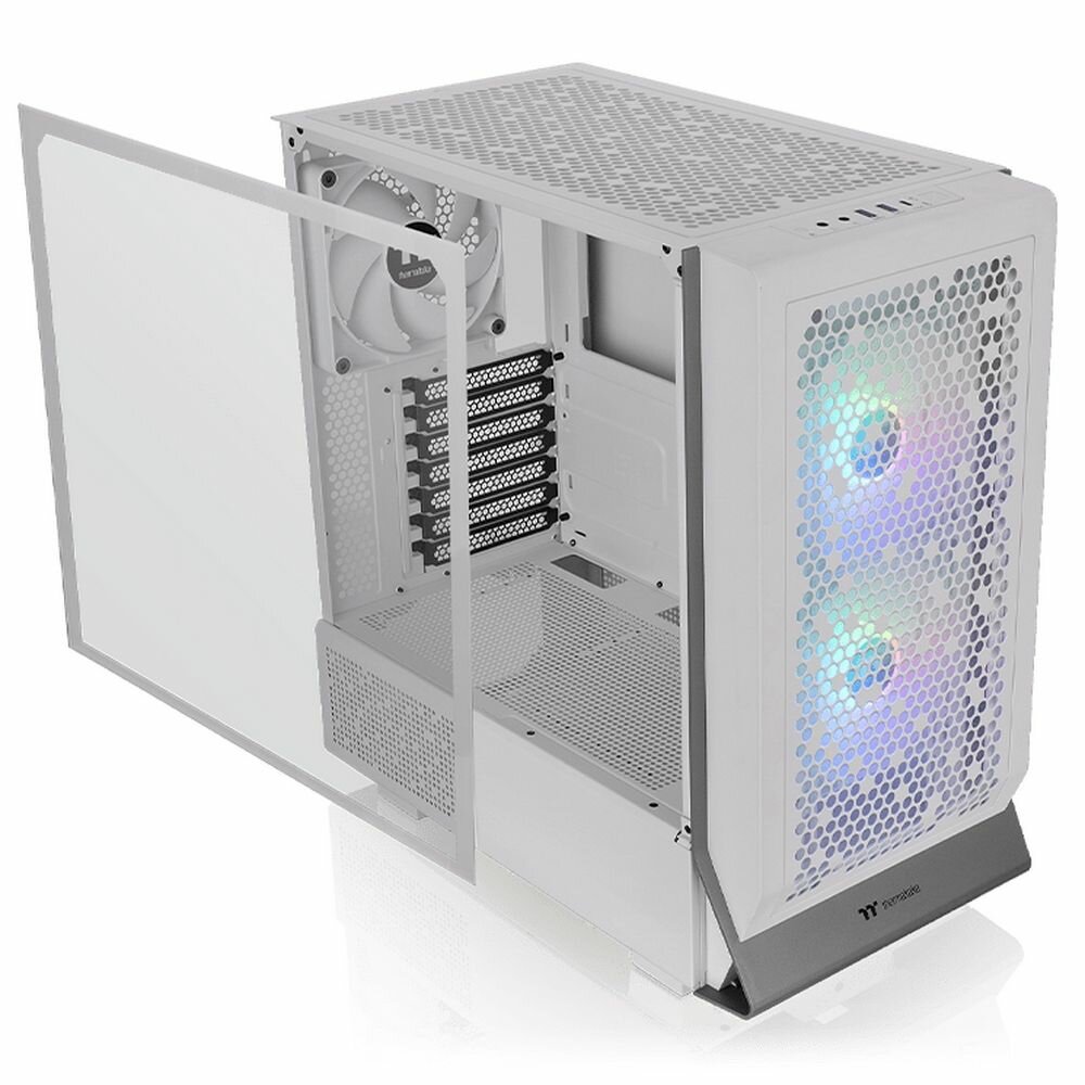 Корпус Thermaltake Ceres 300 Snow представлен в белом цвете в формате Mid-Tower. Для устойчивости конструкции используются ножки. Перфорированные передняя и задняя панели обеспечивают эффективную циркуляцию воздуха внутри корпуса. Особенность модели в использовании ARGB-вентиляторов диаметром 140 мм. Для управления эффектами подсветки устанавливается специальное ПО. Допускается установка радиаторов длиной до 280 мм сверху и до 360 мм спереди. Также дополнительно можно устанавливать тыловые, фронтальные и верхние вентиляторы диаметром 120 и 140 мм.[BR]Thermaltake Ceres 300 Snow поддерживает вертикальную установку платы стандарта Micro-ATX, E-ATX, Mini-ITX или Standard-ATX. Слоты PCI-E вращаются, что допускает вертикальную и горизонтальную установку видеокарты длиной до 370 мм. В первом случае используется специальный кронштейн для удлинителей. Во втором случае для фиксации устанавливается держатель, который не допускает провисания видеокарты. На верхней панели расположены разъемы USB 3.2 Gen1 Type-A и USB 3.2 Gen2 Type-C.