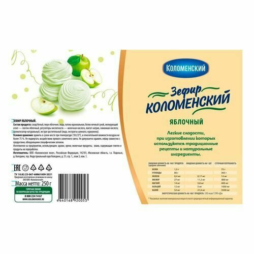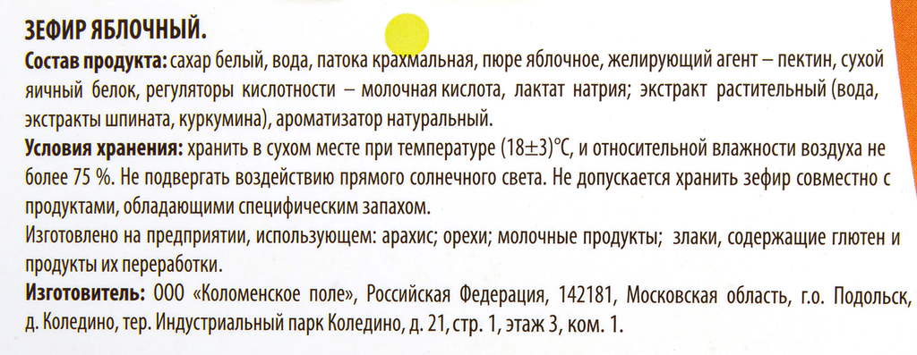| Состав | сахар белый, пюре яблочное, вода, патока крахмальная, белок яичный сухой, желирующий агент - пектин яблочный, регуляторы кислотности - молочная кислота, лактат натрия, лимонная кислота, ароматизатор натуральный, экстракт растительный (вода, экстракты шпината, куркумина) |