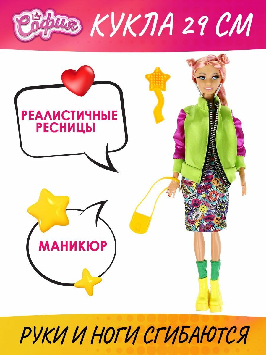 Модница-София одета в неоновую ветровку и платье с ярким принтом. Образ куколки дополняют модные крупные серьги и элегантная сумочка. Одежду и аксессуары легко снять и надеть. С такой модной куклой девочке будет интересно и весело играть: благодаря тому, что руки и ноги куклы подвижны, им можно придать любое положение. У Софии длинные красивые волосы, которые хозяйка куклы сможет заплетать в разные причёски. Детально проработанный дизайн игрушки вдохновит девочку на новые игровые сюжеты.