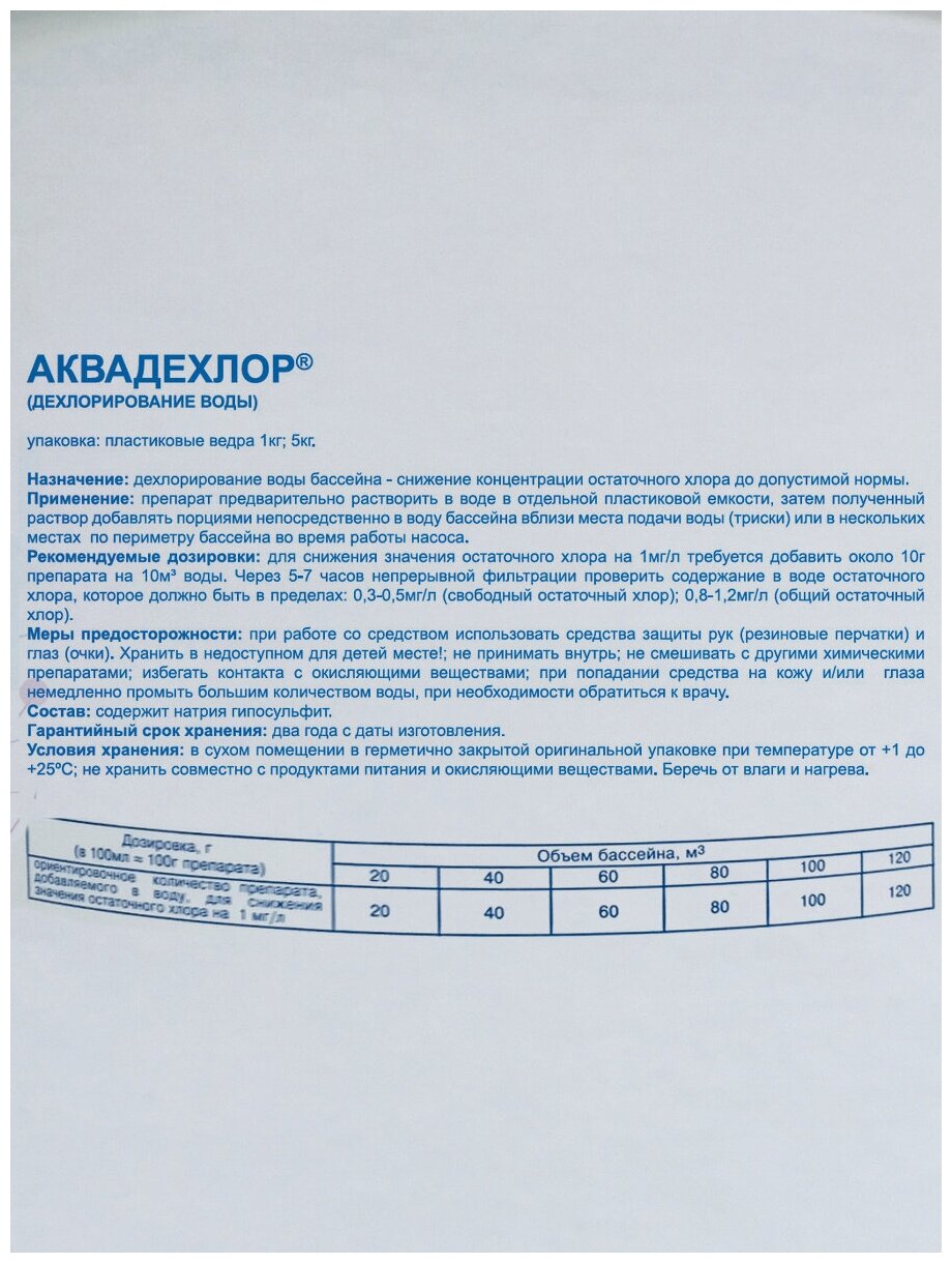 | Способ применения | препарат растворяют в воде в отдельной емкости и затем полученный раствор добавляют порциями в бассейн около места подачи воды во время работы фильтр-насоса, рекомендуемая дозировка |