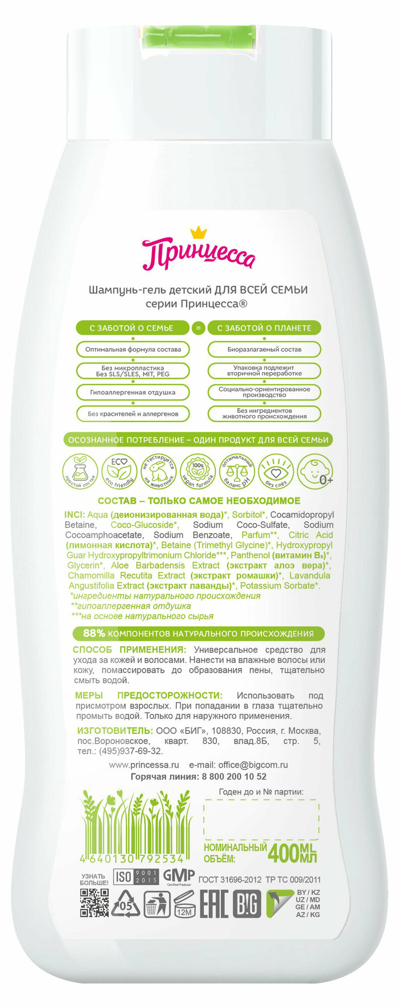 Тщательно проработанные рецептуры составов - это 88% ингредиентов натурального происхождения и 99% полностью биоразлагаемых компонентов. Короткие формулы без сульфатов, парабенов, красителей, микропластика и продуктов животного происхождения - мягкие, гипоаллергенные, адаптированы для любого возраста с самого рождения. Выбирая Принцессу - выбираем осознанный подход к потреблению. Покупая один флакон для всей семьи, мы снижаем потребление, производство и переработку пластика. Продукт не тестируется на животных. Vegan-formula. Упаковка подлежит вторичной переработке. Шампунь-гель подходит для ежедневного применения. Универсальное средство 2в1 может использоваться для бережного очищения кожи и для ухода за волосами.