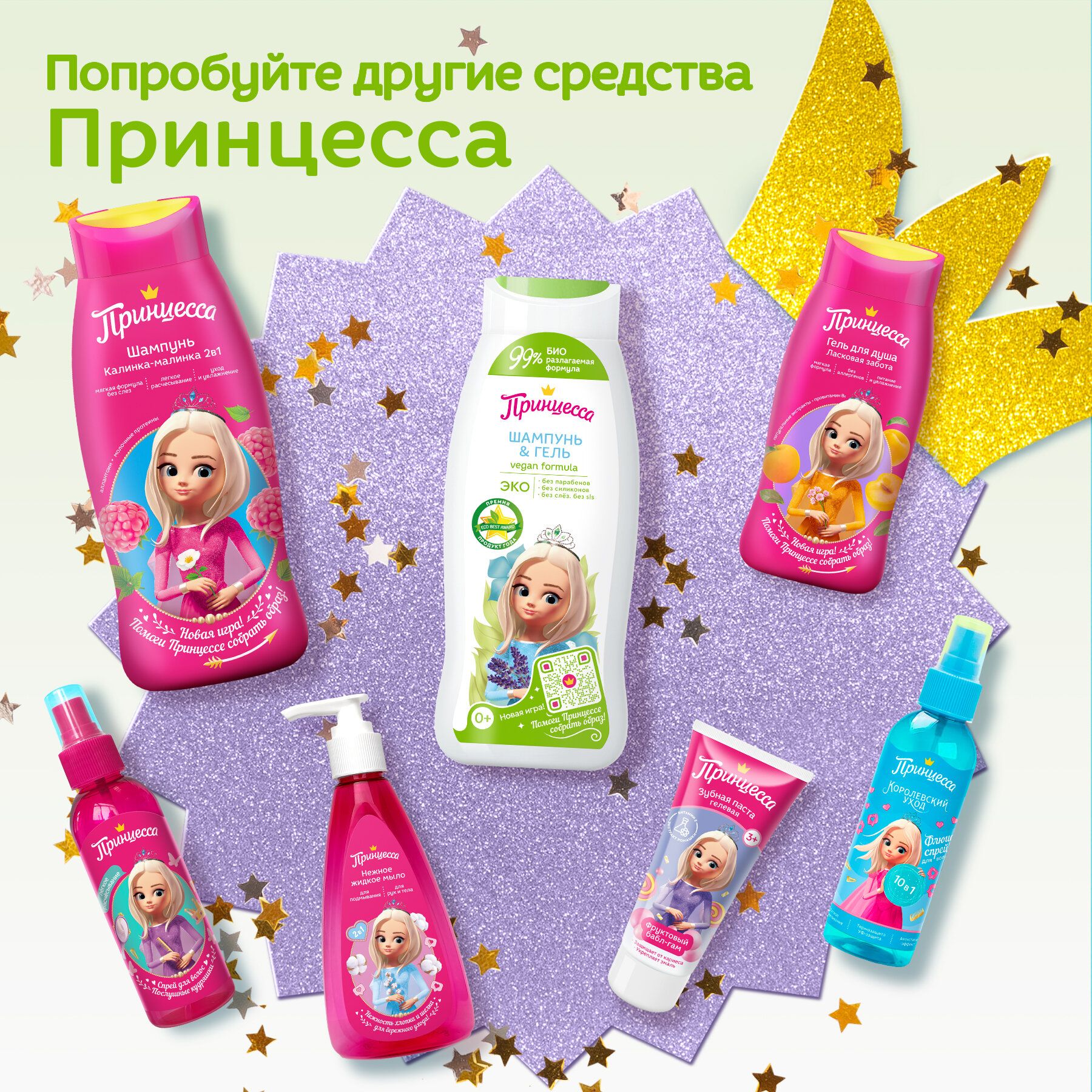 Новая ЭКО серия косметики Принцесса "Для всей семьи" создана с заботой о здоровье наших детей и нашей планеты, которую мы оставим им в наследство. Уникальный аромат новой серии - утренней свежести, росистой зелени, солнечных лучей - аромат прекрасного будущего, чистого, дружелюбного, светлого.