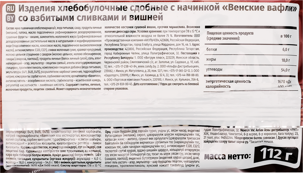 | Состав | Мука пшеничная высшего сорта, продукты яичные (меланж), сахар, патока, масло подсолнечное рафинированное дезодорированное, вода, рафинированные дезодорированные растительные масла (кокосовое, рапсовое), сушеные фрукты – вишня, молоко цельное сгущенное с сахаром (молоко цельное, молоко обезжиренное, сахара (сахароза, лактоза)), сливки молочные сухие, сыворотка молочная сухая, соль, продукты яичные (белок яичный сухой), эмульгатор – лецитин, желирующий агент – агар, разрыхлитель – карбонат аммония, консервант – сорбиновая кислота, ароматизатор Ванилин, влагоудерживающий агент – глицерин, антиокислитель – аскорбиновая кислота, регулятор кислотности – кислота лимонная. |