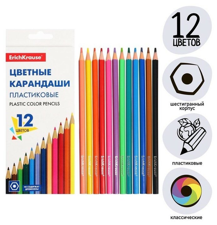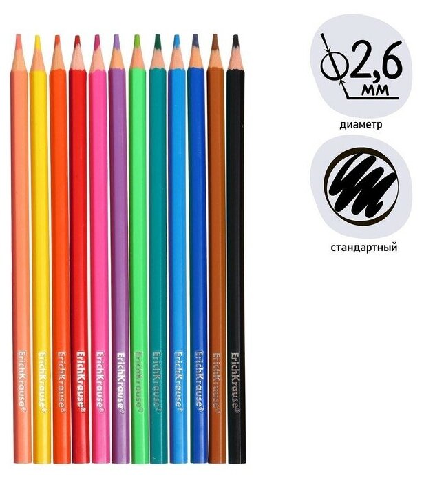 Пластиковые цветные карандаши ErichKrause Basic представлены широкой палитрой оттенков, которые хорошо смешиваются между собой, позволяя создавать рисунки любой сложности. Благодаря шестигранной форме, карандаши удобно лежат в руке и не скатываются с поверхности. Специальная технология изготовления карандаша методом экструзии надежно фиксирует грифель к корпусу, что обеспечивает высокую ударопрочность. Идеальная центровка грифеля и пластичность материала карандаша гарантирует легкую заточку с экономным расходом карандаша. Грифель диаметром 2.6 мм не ломается и не крошится даже при сильном нажиме. Цвета в наборе: 1. Желтый, 2. Оранжевый, 3. Красный, 4. Розовый, 5. Лососевый, 6. Лиловый, 7. Синий, 8. Голубой, 9. Салатовый, 10. Зеленый, 11. Коричневый, 12. Черный.