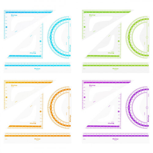 В набор пластиковых чертежных принадлежностей входят линейка 20 cм, треугольник 30-60 , 15 см, треугольник 45-45 , 10 см, линейка-транспортир 180 . Изделия отличаются высококачественной градуировкой, нанесенной с использованием УФ чернил для наилучшей устойчивости. Эргономичный дизайн позволяет избежать смазанных линий при черчении. Принадлежности имеют безопасные закругленные края.