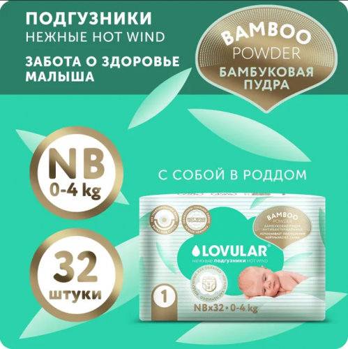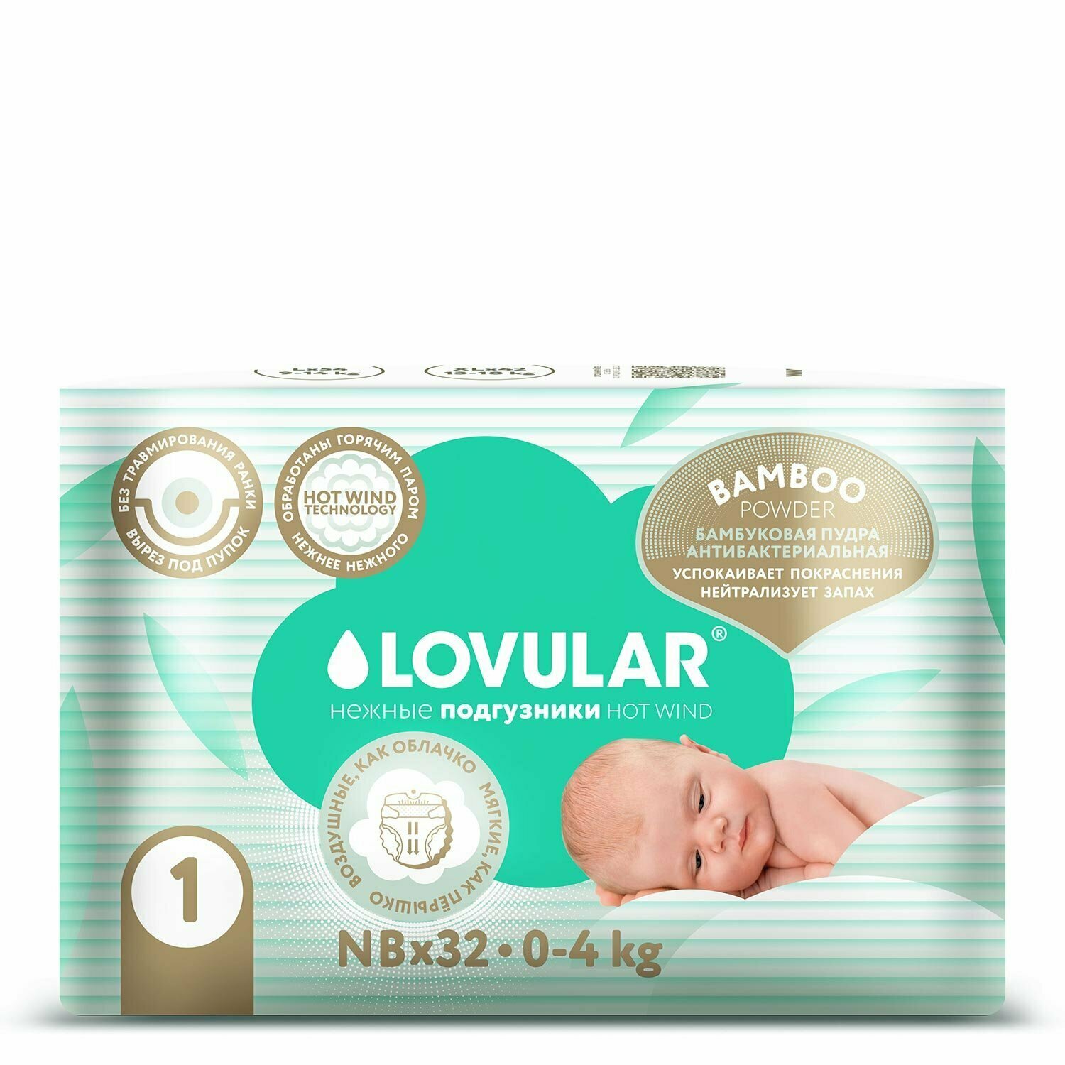 Подгузники Lovular Hot Wind Bamboo Powder 0-4 кг 32 шт (размер: 1/NB (2-5 кг))