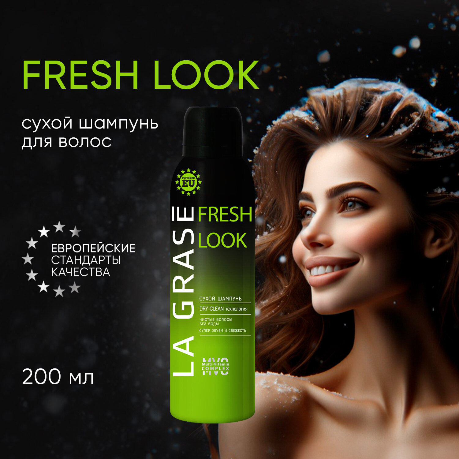 Каждый знает несколько нехитрых способов (головной убор, конский хвост, пучок и т.д.) нивелировать не слишком свежие волосы. К сожалению, эти приемы не работают на 100%, а только слегка камуфлируют грязные пряди. В экстренных случаях на помощь придет сухой шампунь La Grase Fresh Look. Это уникальное средство, которое позволяет освежить прическу, когда нет времени или возможности помыть голову. Понадобиться пара минут, чтобы привести волосы в порядок. Специальная Dry-clean технология без воды и сушки реанимирует внешний вид волос, устраняет их чрезмерную жирность, придает объем и обеспечит чувство чистых и свежих волос. Мультивитаминный комплекс MVC дополнительно питает волосы витаминами, наполняет их энергией и блеском. Легкий приятный аромат средства не останется на локонах и не перебивает аромат любимого парфюма. Благодаря своей пудровой основе и мелкодисперсному распылению, шампунь наносится на волосы дымкой, за пару минут впитывает загрязнения и легко удаляется с помощью расчески. Является идеальным средством для использования между стандартным мытьем волос. Подходит для всех типов волос. Европейское производство гарантирует высокое качество продукции. Не забудьте хорошо встрахнуть флакон перед использованием. Дозатор оснащен антивандальным замком.