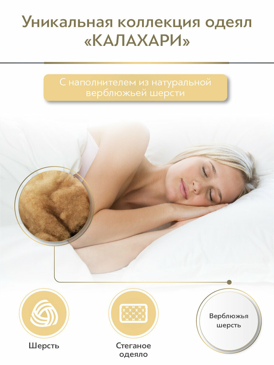 Одеяло 1,5-спальное Daily by Togas Калахари, 140х200 см имеет состав, верх, 100% хлопок-тик, наполнитель, 60% верблюжья шерсть, 40% полиэфирное волокно. Верблюжья шерсть обладает присущими только ей свойствами. Она прочнее и легче многих видов шерсти, имеет полую структуру, благодаря которой поддерживает постоянную температуру тела. Верблюжья шерсть не только удерживает воздух, но и поглощает влагу, быстро ее испаряет, оставляя тело сухим. Шерстяной наполнитель не электризуется и имеет свойство снимать статическое напряжение. Уход, может применяться машинная стирка при температуре не выше 30 градусах. Не отбеливать. Не гладить. Сушить при низких температурах.