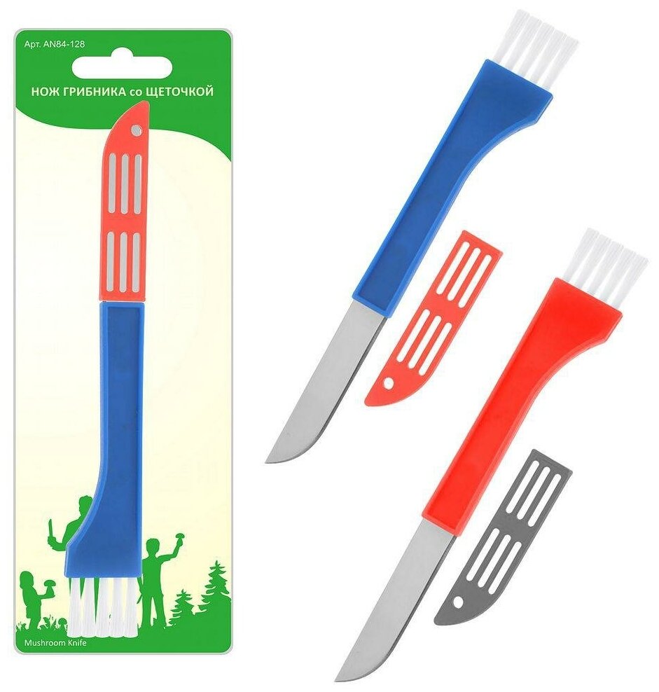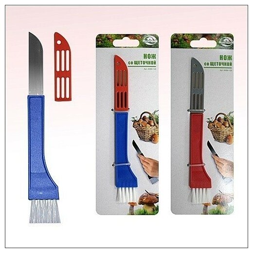 Нож предназначен для походов за грибами. Лезвием аккуратно срезаете гриб, а щеточкой очищаете от загрязнений шляпку и ножку гриба. Обработанные грибы дома чистить уже не потребуется. Изготовлено: лезвие из коррозионностойкой (нержавеющей) стали, ручка и чехол из пластмассы (нейлон), щеточка из синтетической щетины (полипропилен).