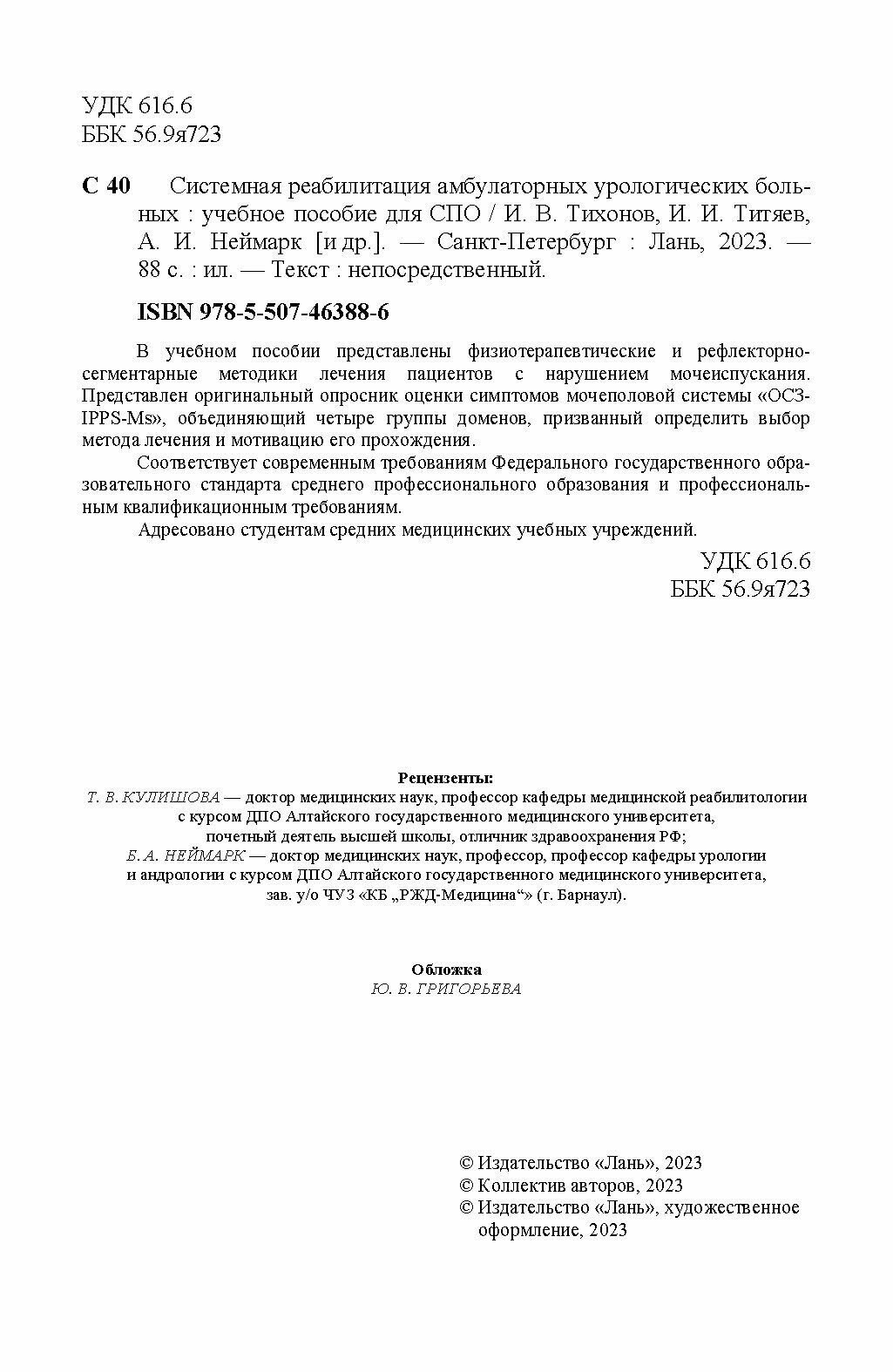 Системная реабилитация амбулаторных урологических больных. Учебное пособие для СПО (И. В. Тихонов); Издательство ЛАНЬ, 2023