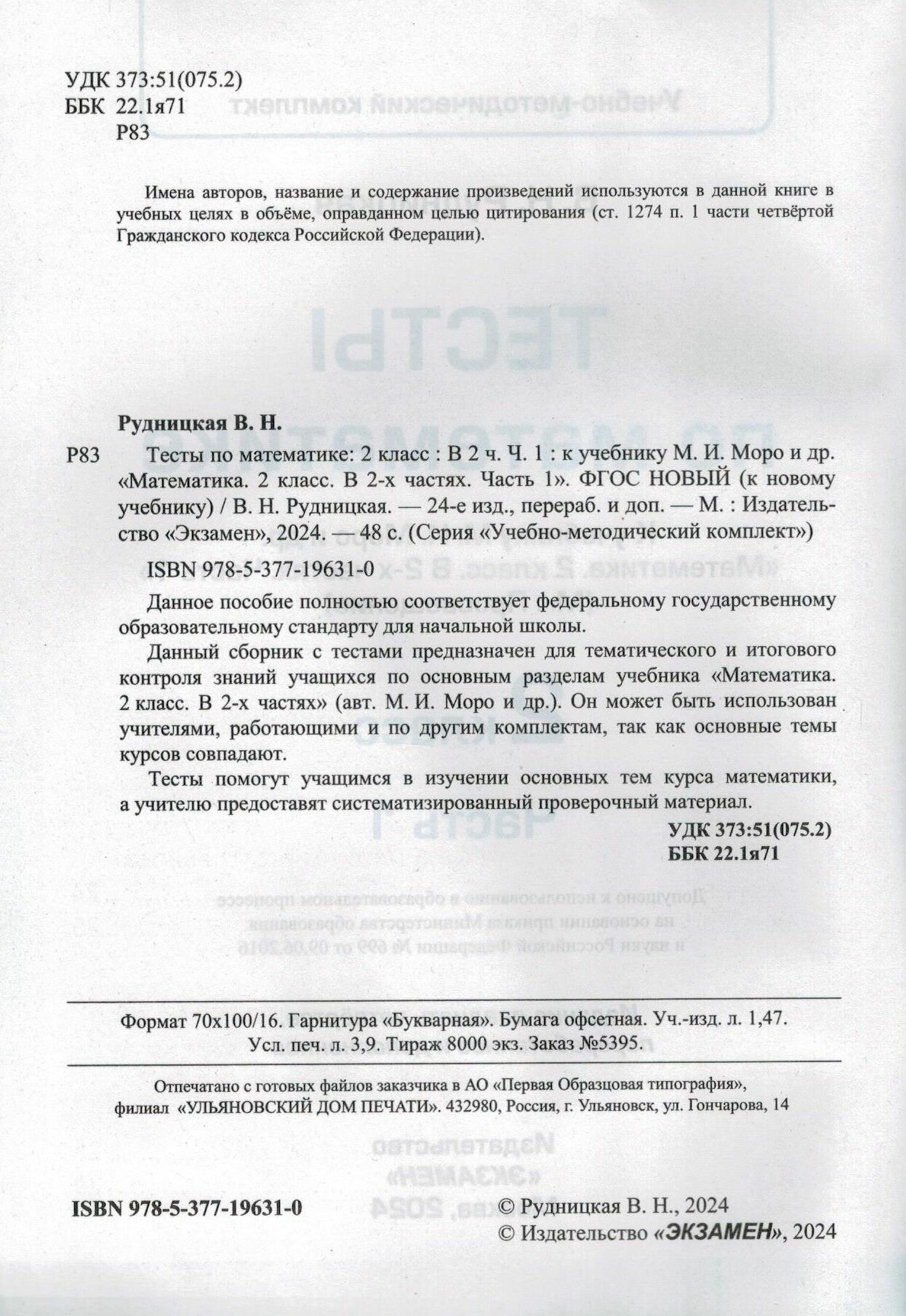 Математика. 2 класс. Тесты к учебнику М. И. Моро и др. В 2-х частях. Часть 1 (Рудницкая Виктория Наумовна); Экзамен, 2024