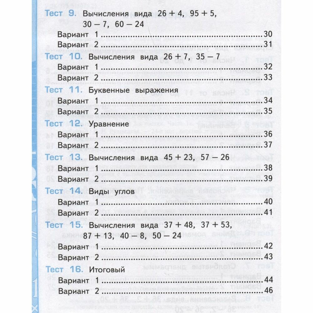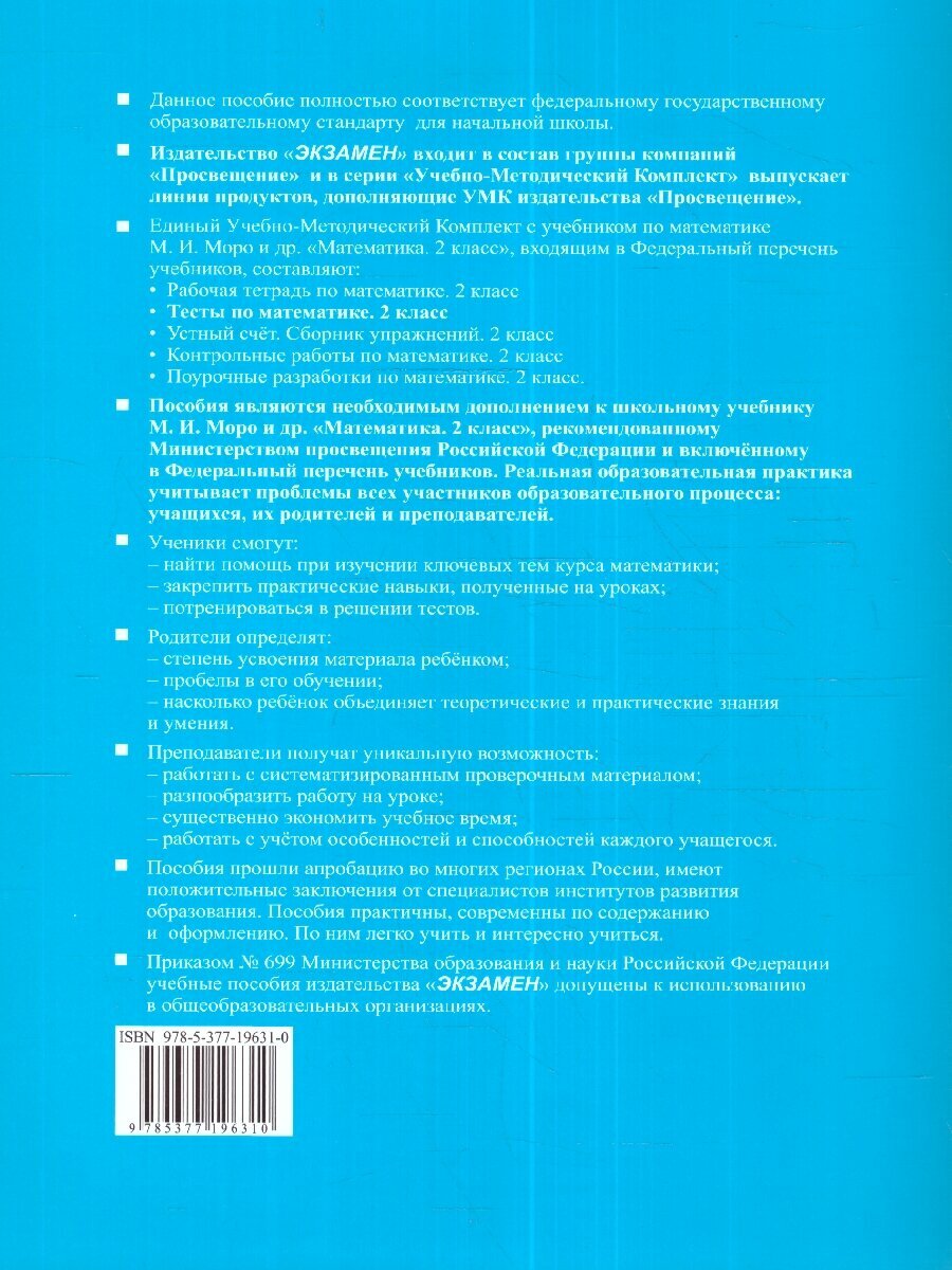 Данное пособие полностью соответствует федеральному государственному образовательному стандарту для начальной школы. Данный сборник с тестами предназначен для тематического и итогового контроля знаний учащихся по основным разделам учебника "Математика. 2 класс. В 2-х частях" (авт. М. И. Моро и др.). Он может быть использован учителями, работающими и по другим комплектам, так как основные темы курсов совпадают. Тесты помогут учащимся в изучении основных тем курса математики, а учителю предоставят систематизированный проверочный материал.