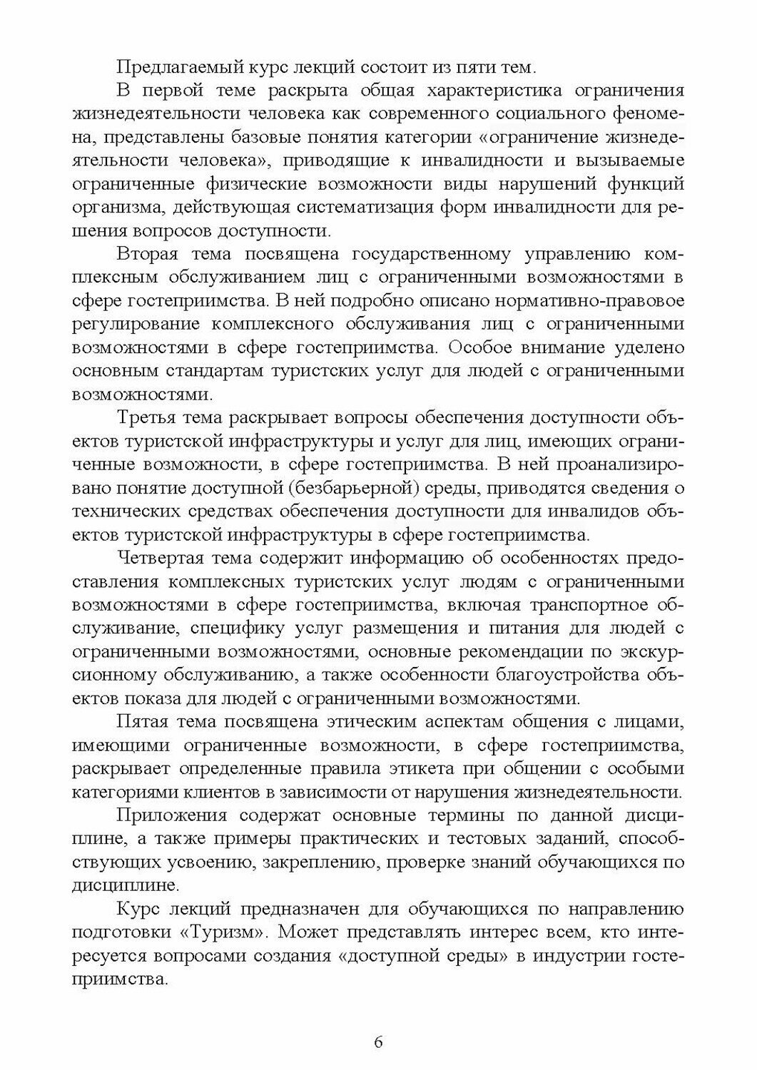 "Учебное пособие содержит теоретические основы комплексного обслуживания лиц с ограниченными возможностями в сфере гостеприимства. Раскрывает общую характеристику феномена ограничения жизнедеятельности человека, сущность государственного регулирования комплексного обслуживания лиц с ограниченными возможностями в сфере гостеприимства, требования к обеспечению доступности объектов туристской инфраструктуры и предоставлению комплексных туристских услуг лицам с ограниченными возможностями в индустрии туризма.