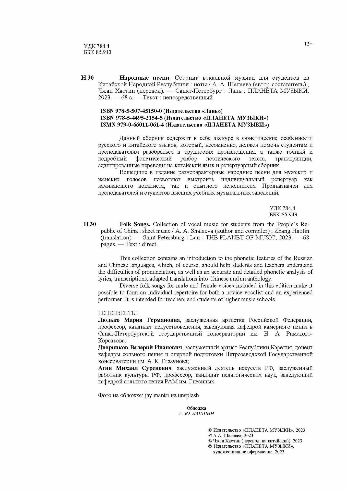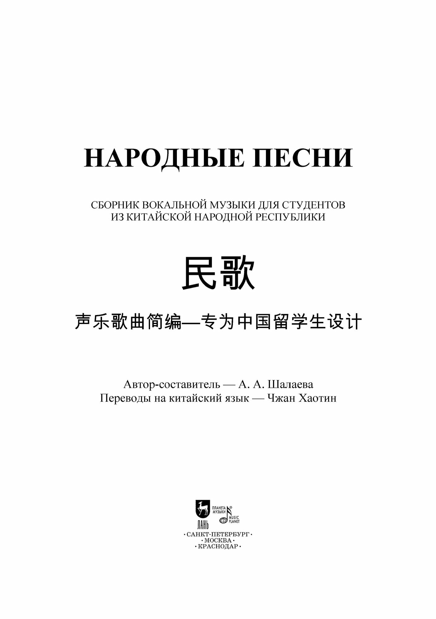 Народные песни. Сборник вокальной музыки для студентов из Китайской Народной Республики. Ноты (Группа авторов); Издательство «Планета музыки», 2023