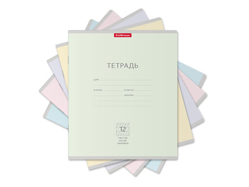 Тетрадь школьная ученическая формата А5+ (170х203 мм). Обложка из высококачественного мелованного картона плотностью 180 г/м2. В блоке 12 листов в частую косую линейку с полями. Бумага офсетная плотностью 60 г/м2. Цвет линовки - синий. Скругленные уголки обложки и блока. Тип скрепления - скоба. Тетради одного цвета упакованы в термоусадочную пленку по 10 штук. Товар поставляется в нескольких вариантах цвета без возможности выбора.