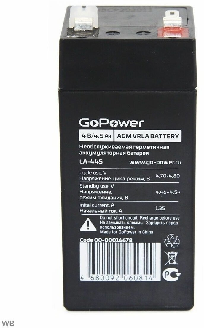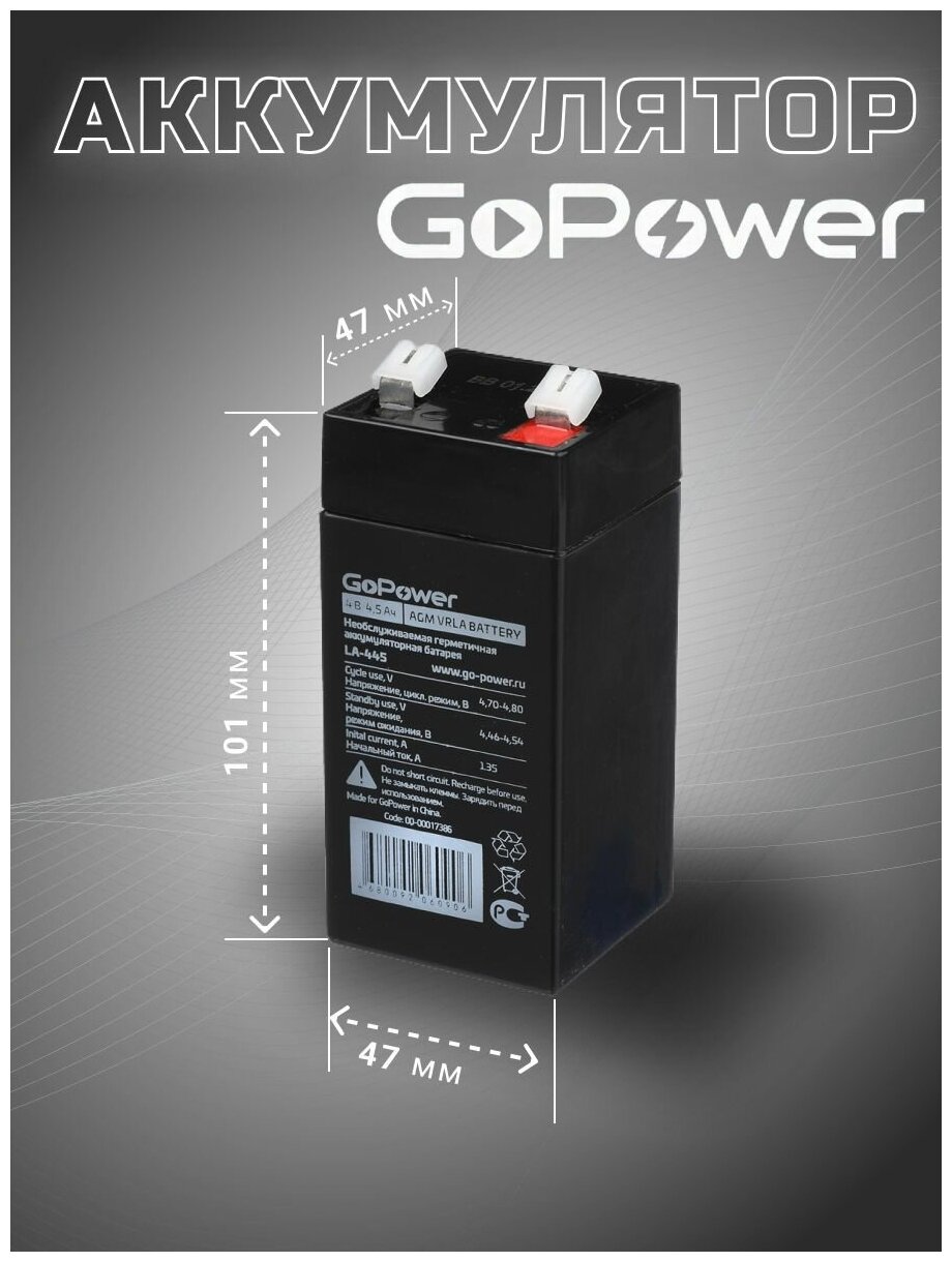 Аккумулятор свинцово-кислотный 4V 4.5Ah GoPower 00-00016678 герметизированный, необслуживаемый, с системой рекомбинации газов (VRLA). Производится по технологии AGM - электролит абсорбирован в стекловолоконном сепараторе, что обеспечивает абсолютную защищенность от утечки электролита. Материал корпуса и крышки сделан из огнеупорного ABS пластика.